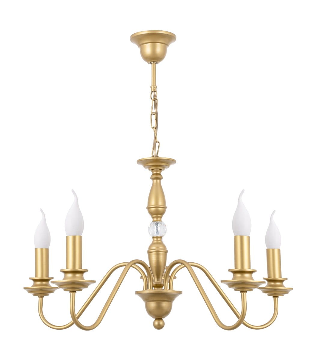 Stylowy złoty żyrandol klasyczny KRISTAL CLASSIC. Duży świecznikowy żyrandol zachwyca swoją prostotą. Pięknie wypełni jasne wnętrza salonu, sypialni jak również jadalni. Będzie pasował do każdej aranżacji. Ciekawym dodatkiem żyrandola jest przeźroczysty kryształ , który powoduje że lampa błyszczy.