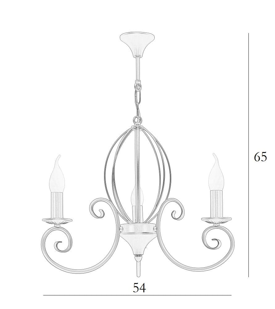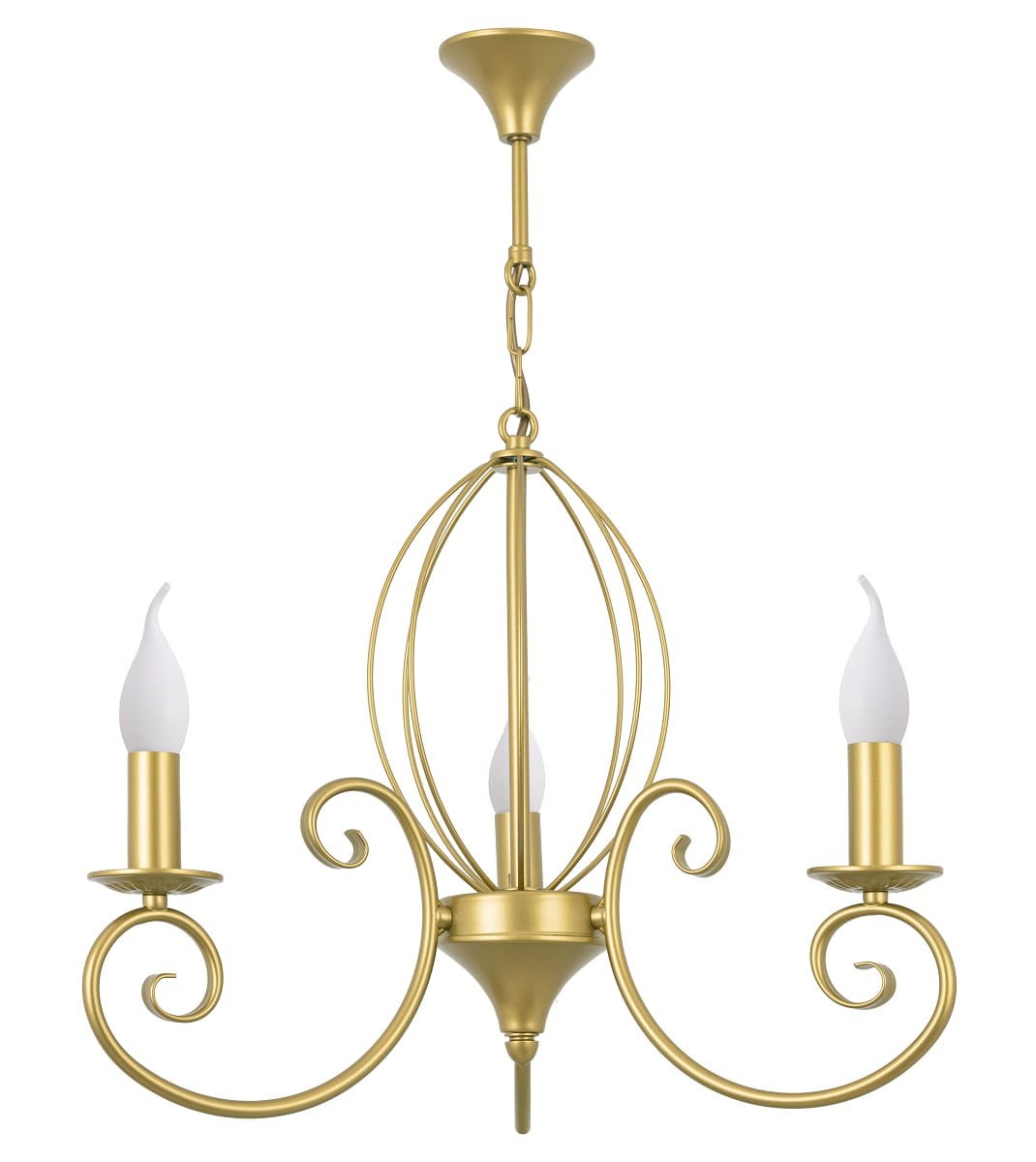 Stylowy żyrandol świecznikowy. Piękna lampa wisząca w ponadczasowym, złotym kolorze pasuje do wielu aranżacji. Żyrandol zwraca uwagę ciekawym kształtem- metalowa, owalna klatka w centralnej części lampy została zakończona od dołu ozdobnym elementem, wygięte ramiona świetnie komponują się z całością. Żyrandol najpiękniej wygląda w połączeniu z ozdobnymi żarówkami świecznikowymi typu "płomyk", które podkreślą jego nieco pałacowy charakter.
