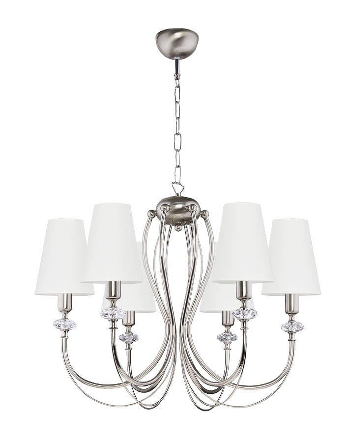 Stylowy żyrandol z kryształkami, uwagę zwraca piękny stelaż- klasyczny a jednocześnie nieprzesadzony, ozdobiony kryształowymi elementami. Stelaż idealnie komponuje się ze zgrabnymi wysokimi abażurkami. Abażurki są dostępne w szerokiej gamie tkanin, dzięki czemu mogą Państwo idealnie dobrać odpowiednie do swojego wnętrza. Idealny żyrandol do eleganckiego salonu.