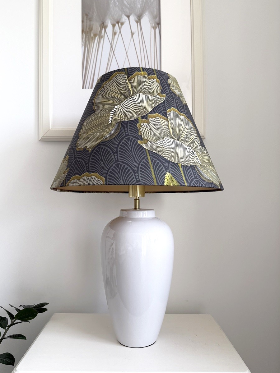 Szary abażur do lampy stojącej w złote kwiaty maków ze złotym wnętrzem. Wyjątkowy produkt, ręcznie wykonany z importowanej tkaniny, z dbałością o detale. Abażur jakości premium dostępny wyłącznie w naszych sklepach, powstał z pasji do pięknych dodatków. Przepięknie prezentuje się w wyjątkowych wnętrzach zarówno klasycznych jak i nowoczesnych, na tle jasnych kolorów z akcentami złota. Wnosi do wnętrza styl, elegancję i ciepłe, złote światło.