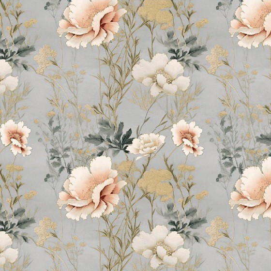 | MATERIAŁ | MAKI WELUR - szara aksamitna tkanina w kwiaty maków w kolorze łososiowym ze złotymi akcentami, od spodu ZŁOTA folia |