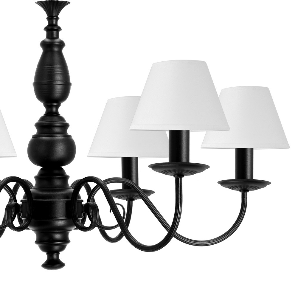 Szeroki czarny żyrandol do dużego salonu lub przestronnej jadalni. Piękny, elegancki stelaż, perfekcyjnie wykonany i zaprojektowany został wykończony białymi, zgrabnymi abażurkami. Jeśli do Twojego pomieszczenia będą pasowały abażury w innym kolorze istnieje możliwość zmiany tkaniny na dowolną z palety poniżej.