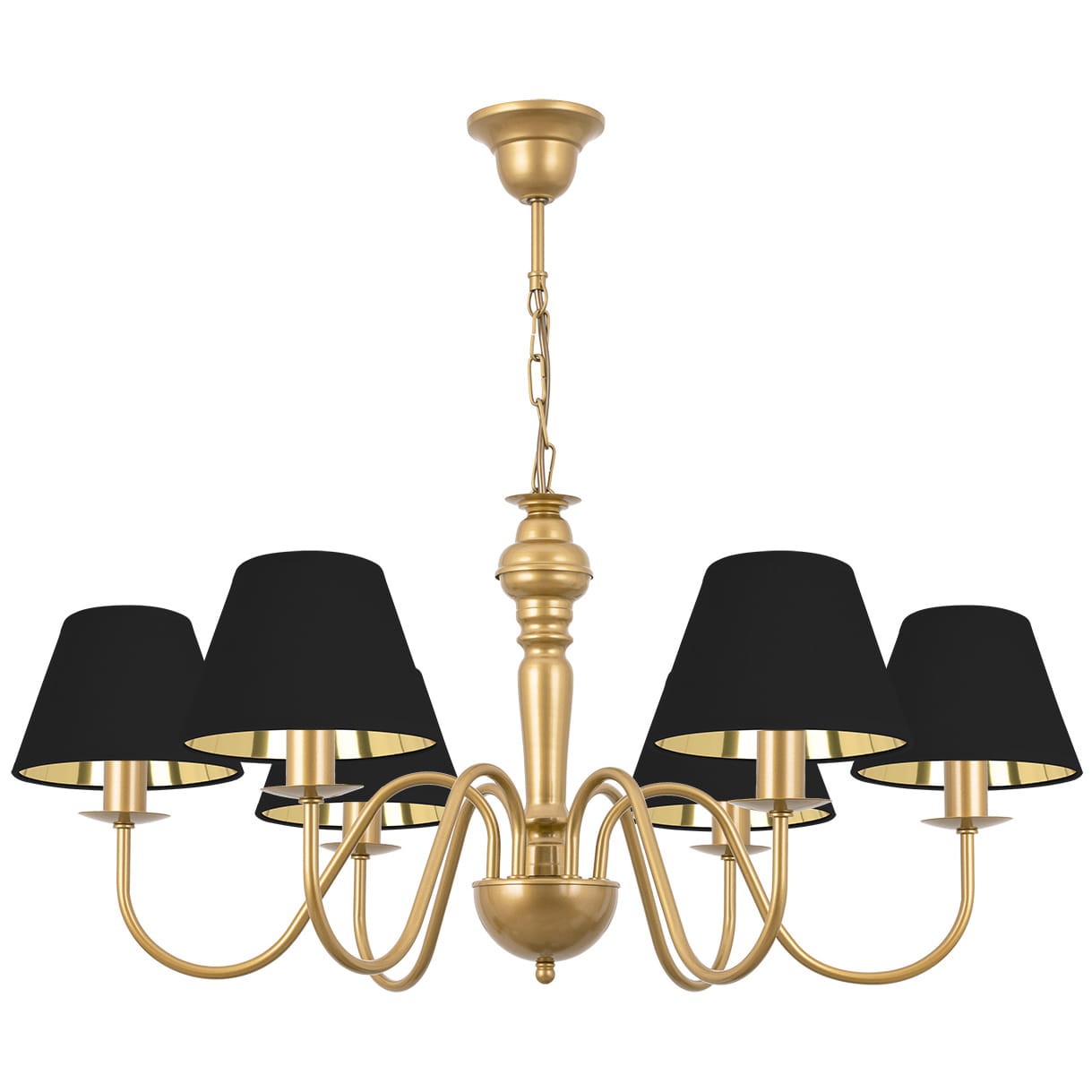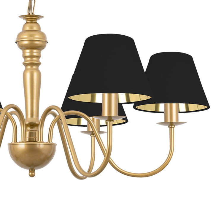 Sześciopunktowa lampa sufitowa do eleganckiego salonu GOLDSUN w złotej oprawie z czarnymi abażurami wykończonymi złotym środkiem to wyjątkowa propozycja do dużych, eleganckich wnętrz. Kontrast pomiędzy głęboką czernią kloszy a złotym stelażem nadaje lampie wyrazistości, a po zapaleniu światła złote wnętrze abażurów rozświetla się ciepłym, nastrojowym blaskiem. To model, który doskonale sprawdzi się jako oświetlenie w przestronnym salonie, nad stołem w jadalni czy sypialni. Elegancki i efektowny, podkreśli charakter wnętrz zarówno klasycznych, jak i nowoczesnych.