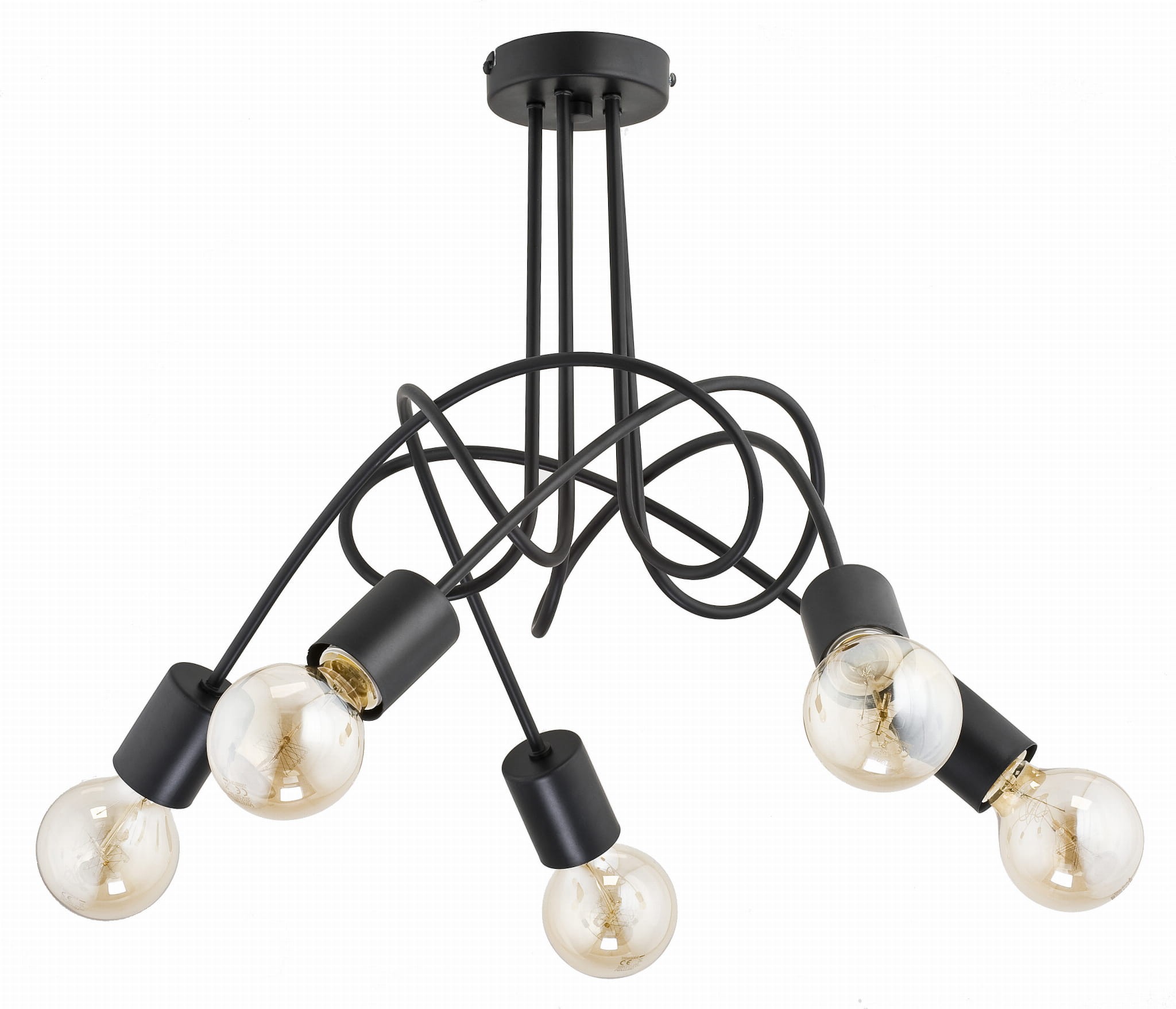 Nowoczesna lampa wisząca plafon TENGA idealnie pasuje do aranżacji w tylu skandynawskim oraz nowoczesnym. Zakręcone ramiona przypominają poplątane przewody, co czyni tą lampę wyjątkowo ciekawą.