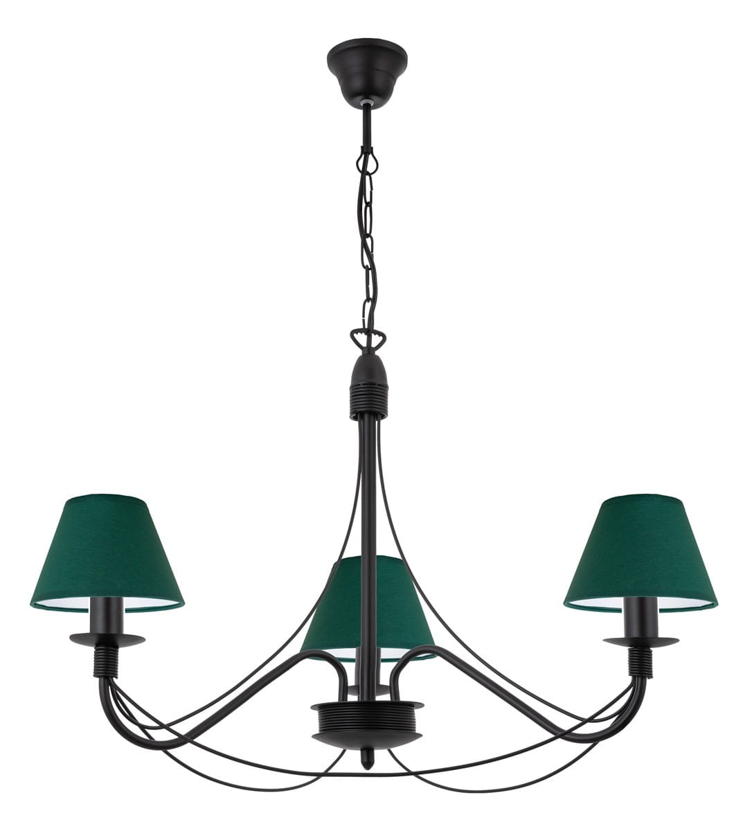 Trzypłomienny czarny żyrandol z abażurami. Klasyczny żyrandol ze smukłym stelażem wykończony ponadczasowymi zielonymi abażurami doda każdemu wnętrzu wyjątkowej elegancji i stylu. Idealny do wnętrz urządzonych w stylu klasycznym. Abażury wykonane z certyfikowanych materiałów.
