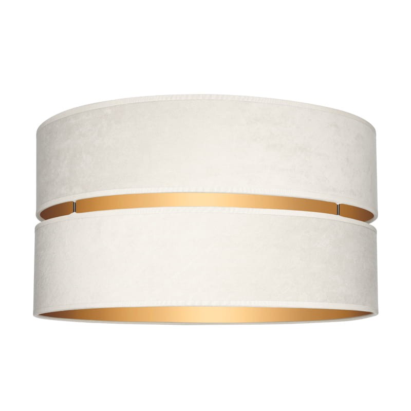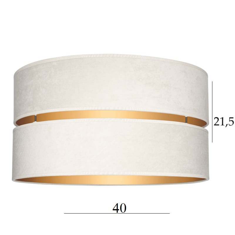 Welurowy abażur w kształcie walca, w kolorze złamanej bieli/ecru ze złotym wnętrzem. Abażur można zamontować zarówno do lampy podłogowej jak i wiszącej. Abażur składa się z dwóch połączonych ze sobą walców, z przerwą po środku, przez którą przenika światło, co daje bardzo ciekawy efekt, w postaci refleksów na ścianie.