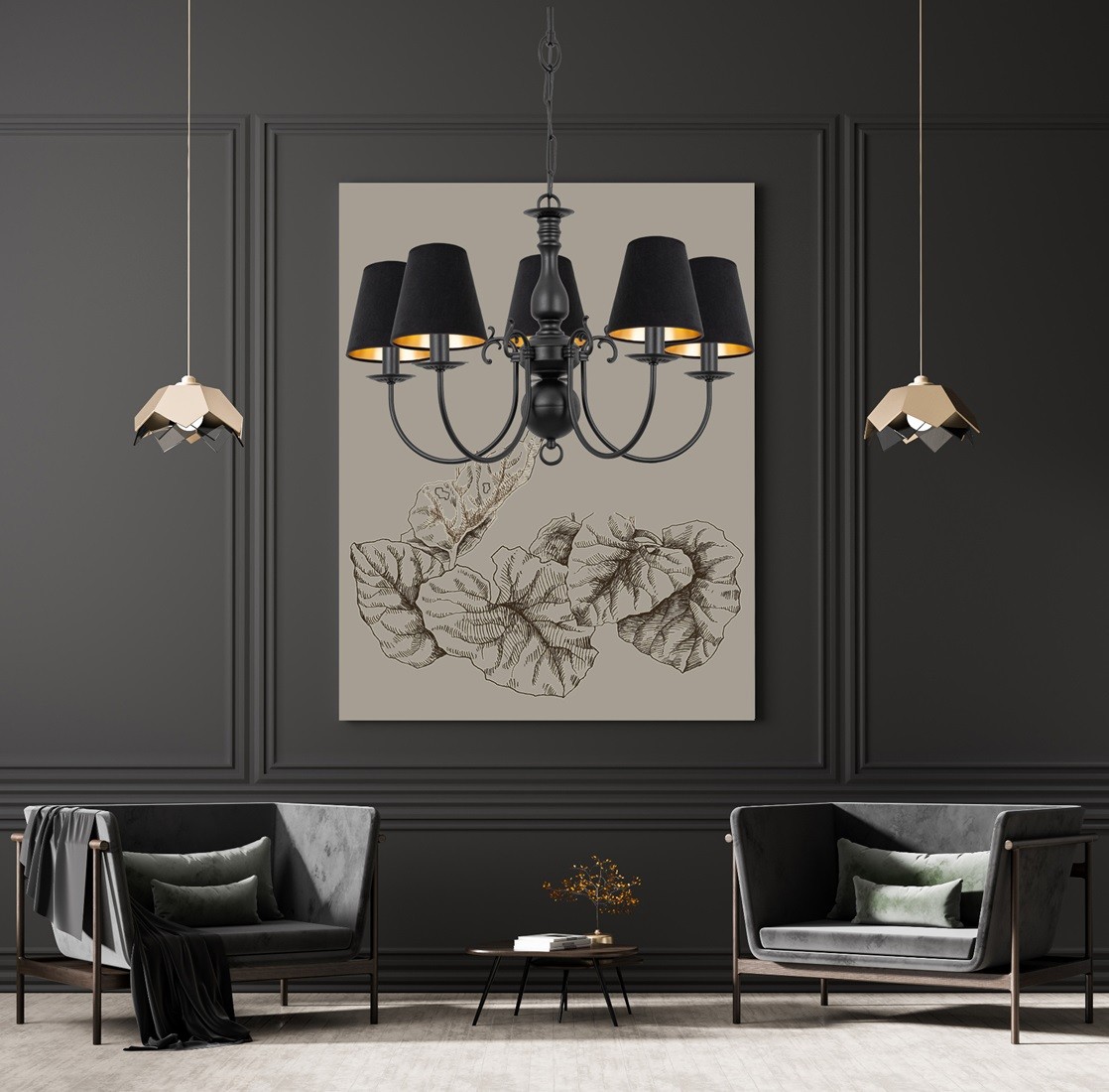 Wisząca czarna lampa 5-ramienna MARIA CZARNA to elegancka, pięcioramienna lampa sufitowa z czarnym stelażem i abażurami z czarnego weluru. Miękki materiał kloszy dodaje całości subtelności i elegancji. To idealna propozycja do salonu, sypialni lub gabinetu urządzonych w klasycznym, eleganckim stylu. Czarne abażury dają nastrojowe, niezbyt intensywne światło.