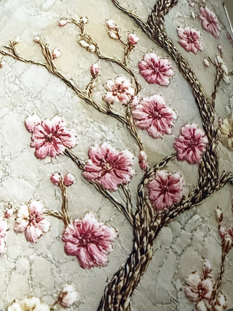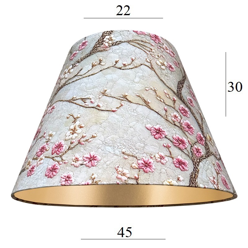 | Abażur | 8S o wymiarach średnica 22/45 cm, wysokość 30 cm, wykonany z bawełnianej tkaniny z wzorem CHERRY, kwiaty kwitnącej wiśni na postarzanym tle, od wewnątrz złota folia |