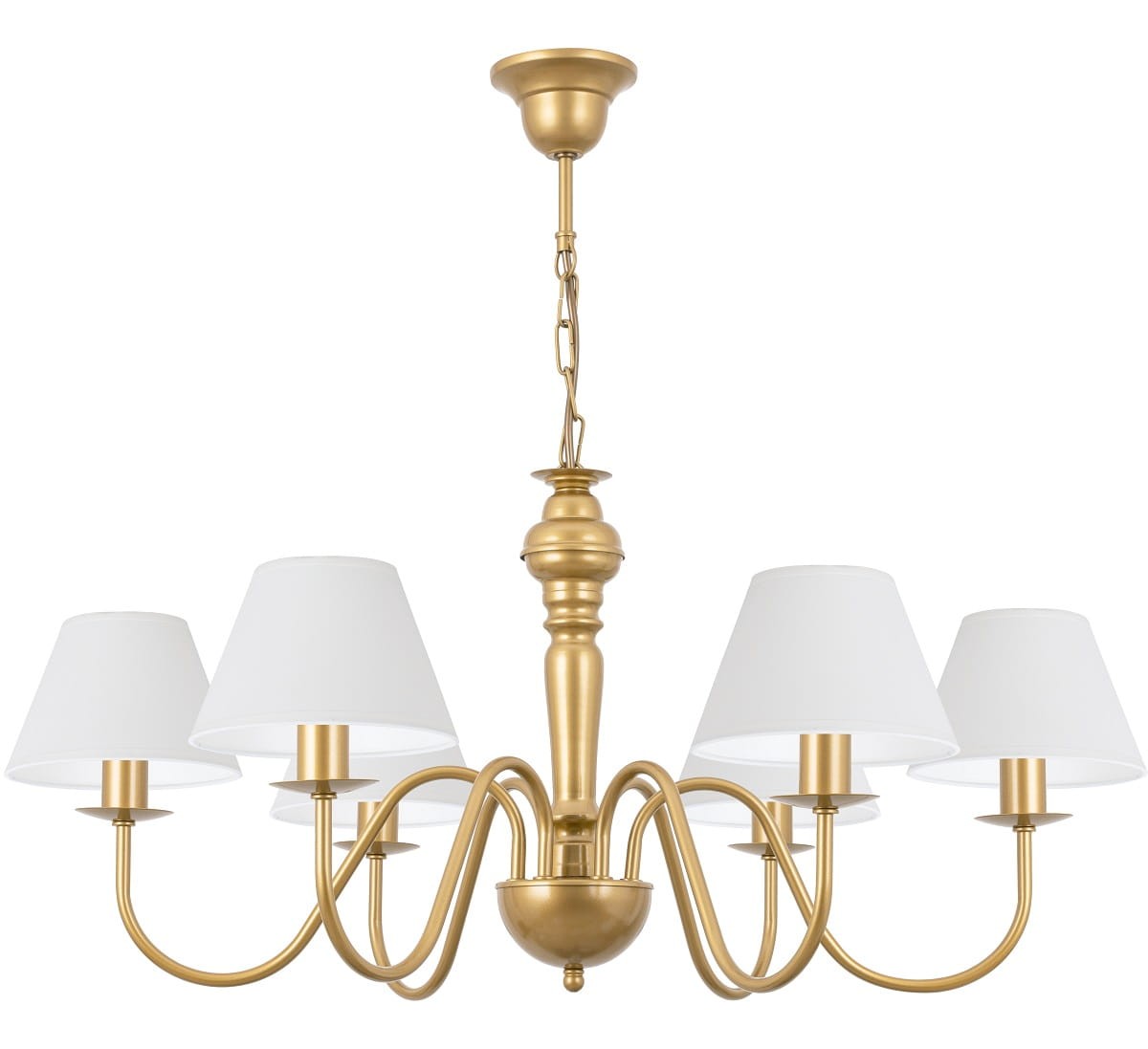 Złota lampa wisząca z abażurami z serii GOLDSUN to model odpowiedni do pokoju dziennego, salonu czy jadalni. Elegancki, złoty stelaż świetnie komponuje się z klasycznymi dodatkami natomiast niewielkie abażury ocieplają całość