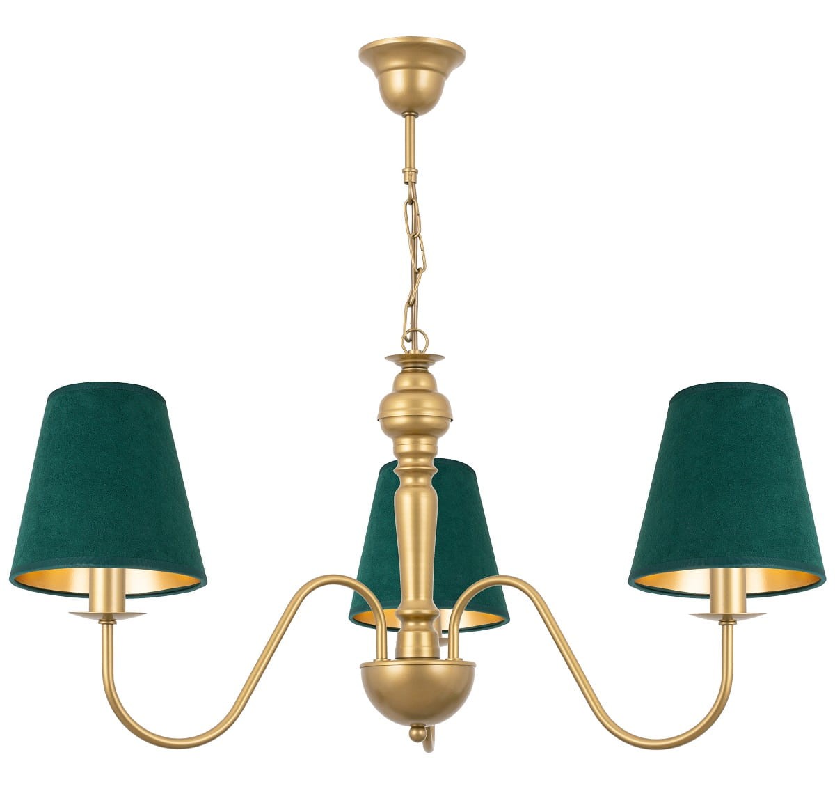 Złota lampa z zielonymi abażurami. Piękny unikatowy 3-ramienny żyrandol w klasycznym stylu. Złoty stelaż wygląda niezwykle elegancko, a dzięki stylowym abażurkom z weluru staje się niepowtarzalny i oryginalny.Taka lampa z pewnością będzie niekwestionowaną ozdobą każdego salonu, sypialni czy jadalni.