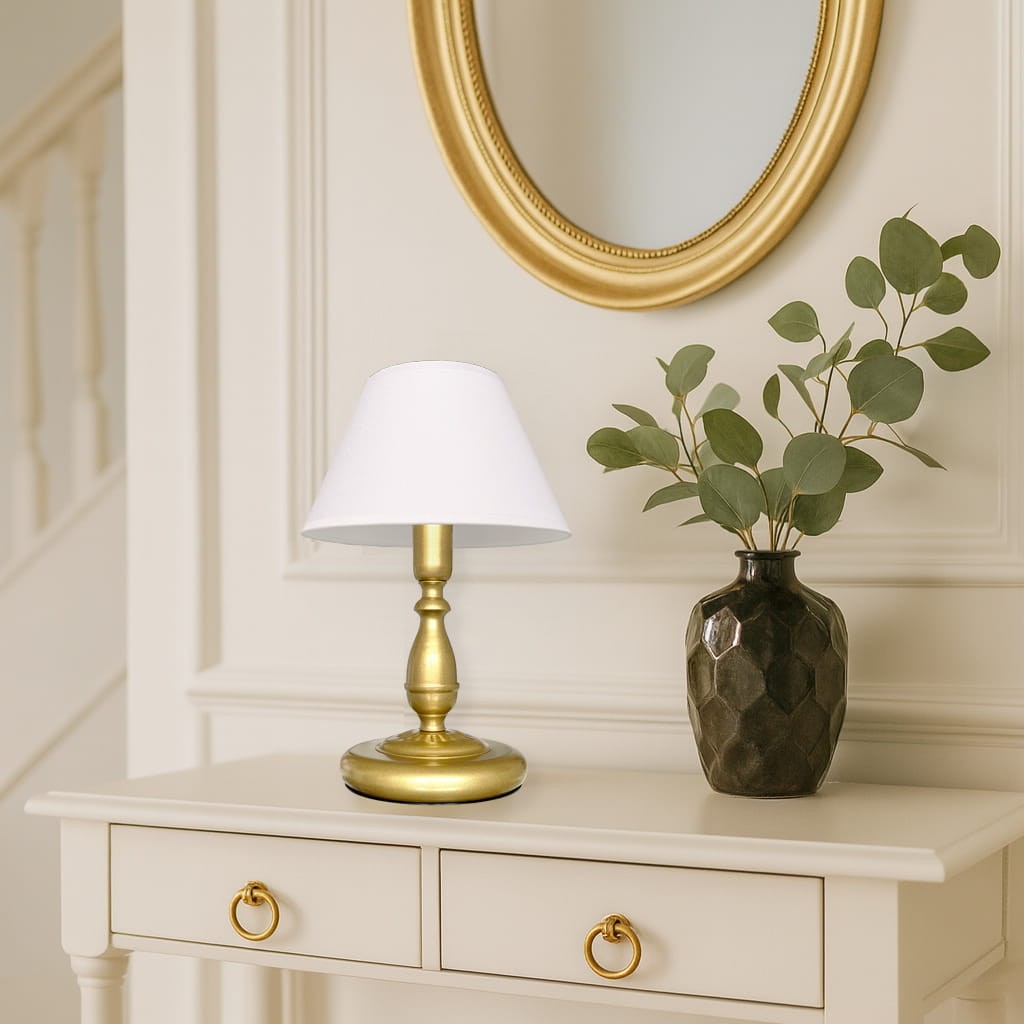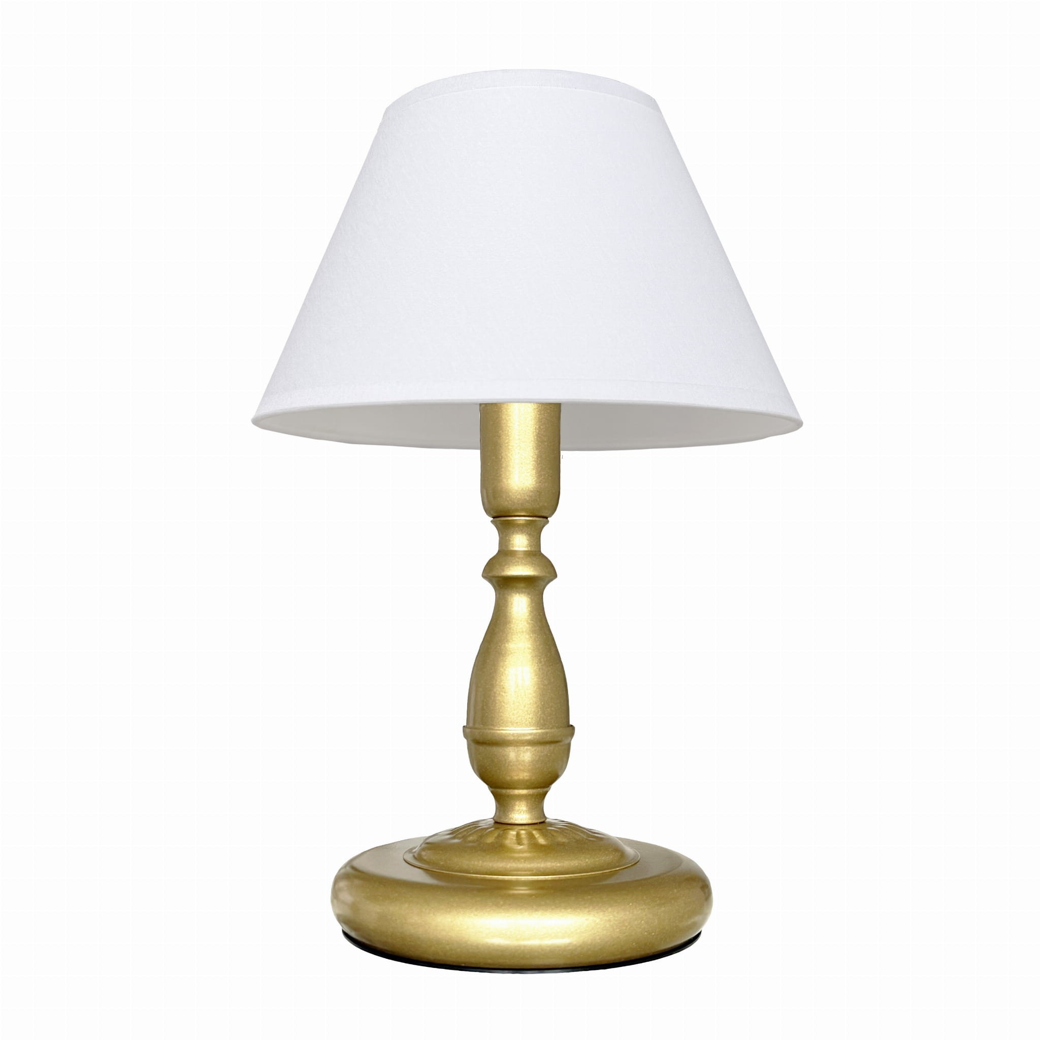 Złota lampka nocna na stolik, w stylu klasycznym. Delikatna lampka JULIA z białym abażurem z tkaniny o klasycznym i ponadczasowym kształcie. Lampka na złotej, metalowej podstawie będzie znakomicie prezentować się w romantycznej sypialni utrzymanej w stylistyce glamour, czy klasycznej. W połączeniu z jasnymi meblami i złotymi dodatkami lampka nocna JULIA doda wnętrzu blasku i niepowtarzalnego uroku. Lampkę JULIA mogą Państwo zamówić z abażurem w dowolnej tkaninie z wzornika poniżej, aby jak najlepiej dopasować ją do wnętrza.