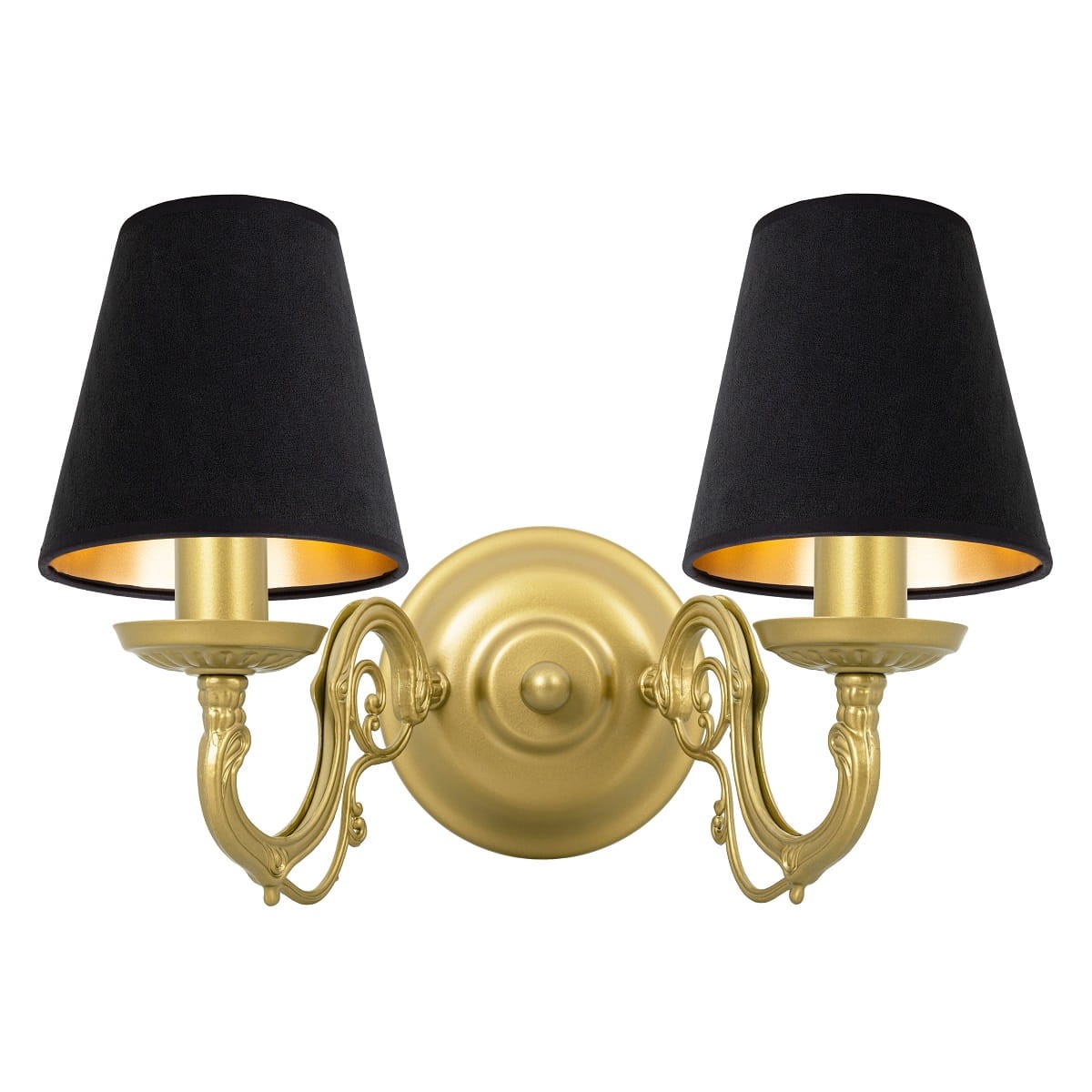 Złota podwójna lampa na ścianę ze złotym stylizowanym stelażem oraz czarnymi abażurkami wykonanymi z weluru. Abażury to bardzo efektowny dodatek, powodujący, że lampa zwraca uwagę niepowtarzalnym stylem. Będzie klasyczną dekoracją każdej sypialni czy salonu.