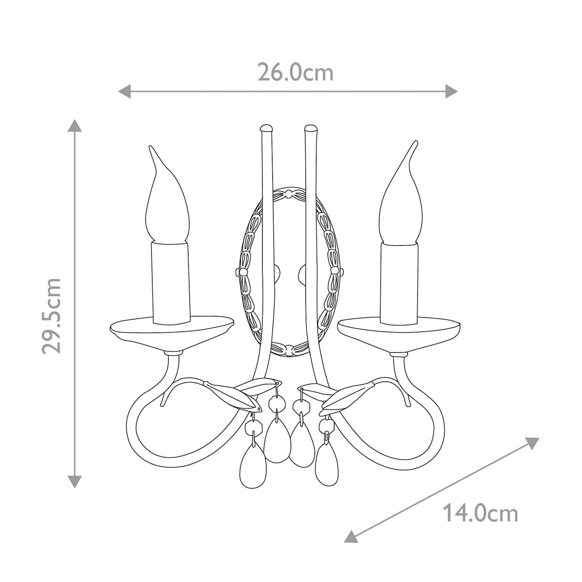 Złoty kinkiet podwójny z kryształami idealnie pasujący do przedpokoju lub sypialni. Wyjątkowo subtelna podwójna lampa z pięknym motywem delikatnych listków. Szklane talerzyki i kryształki znakomicie rozpraszają światło dając ciekawy efekt. Prezentowana lampa wyróżnia się luksusowym wykonaniem, z dużą dbałością o detale, świetnie komponuje się z ekskluzywnie wykończonymi wnętrzami w klasycznym stylu.