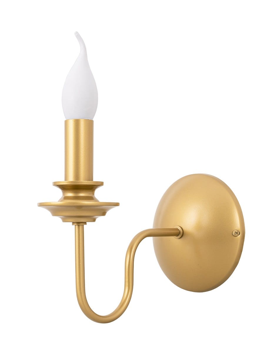 Złoty kinkiet świecznikowy KRISTAL CLASSIC. Ten piękny złoty kinkiet idealnie wpasuje się w każde wnętrze sypialni, salonu jak i pokoju dziecięcego nadając mu niepowtarzalny przytulny klimat. Ozdobą kinkietu jest żarówka w kształcie płomyka.