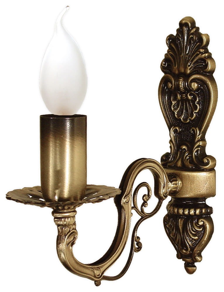 Bogato zdobiony złoty kinkiet świecznikowy do salonu. Podczas aranżacji warto wziąć pod uwagę odległość lampki od ściany, która w przypadku tego modelu wynosi 19 cm. Montowanie na hak.