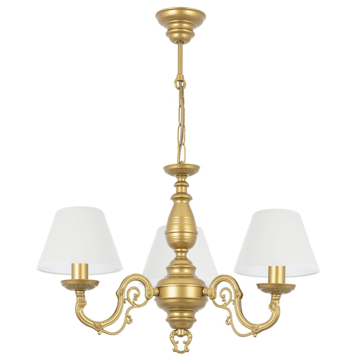 Złoty żyrandol do sypialni VIOLA z abażurami w kolorze białym. Przepiękna lampa wisząca utrzymana w klasycznej stylistyce. Uwagę zwraca piękny korpus lampy, nawiązujący do dawnego oświetlenia pałacowego, dodatkowo w ciekawej kolorystyce stelaż pomalowano na półmatowe złoto, w efekcie uzyskano bardzo dekoracyjną lampę. Do żyrandola idealnie pasują nasze abażurki z tkaniny w kolorze białym.