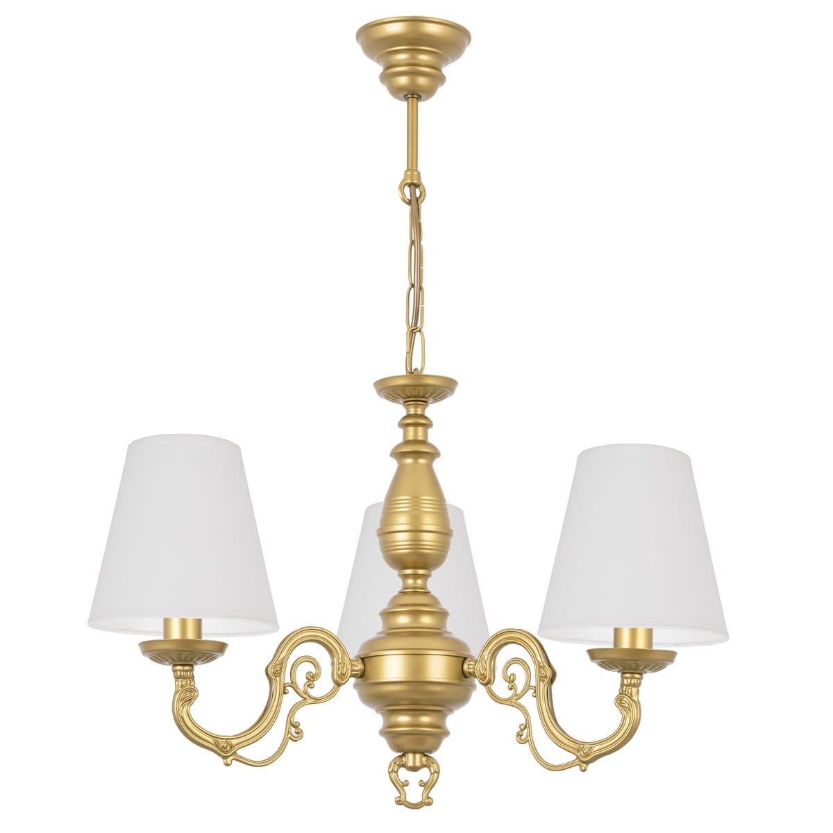 Złoty żyrandol do sypialni w stylu klasycznym. Przepiękny 3-ramienny żyrandol ze stylowymi abażurkami w odcieniu ecru. Jedna z naszych wyjątkowych propozycji skierowanych do miłośników klasycznego wzornictwa piękny stelaż powstał z połączenia ozdobnej metalowej tralki i bardzo efektownych ramion, odlewanych ze znalu. Żyrandol idealnie pasuje do tradycyjnych aranżacji, delikatny odcień złota pięknie wygląda we wnętrzach urządzonych w ciepłych, jasnych kolorach.