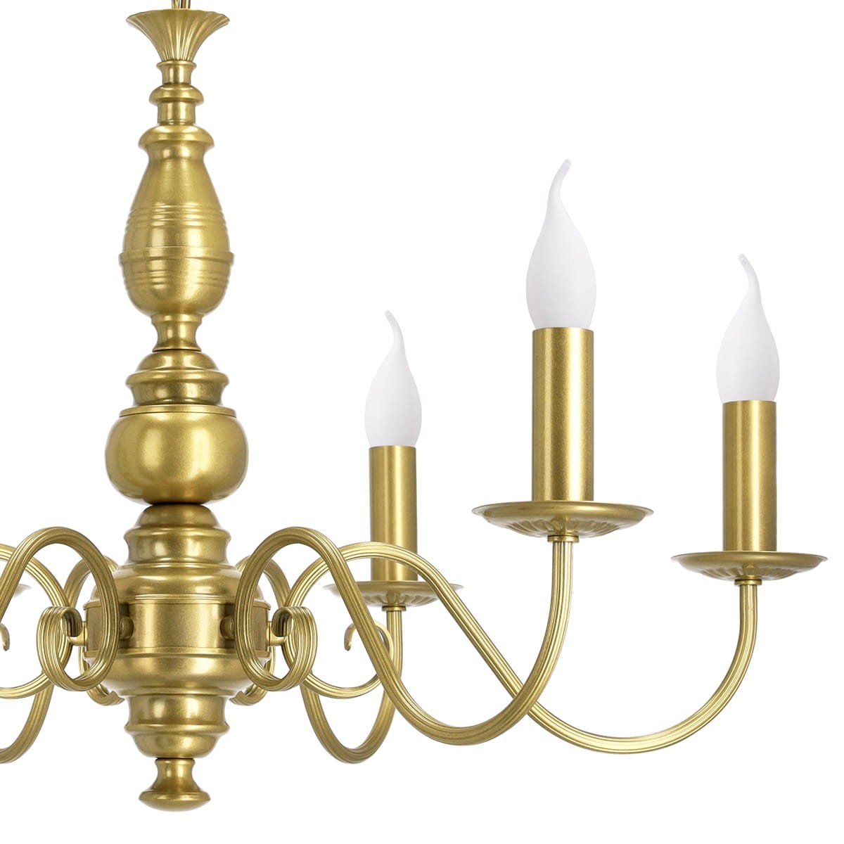 Przepiękny stelaż wzorowany na lampach pałacowych został pomalowany na półmatowe złoto, co dodatkowo podbija efekt. Model przeznaczony do klasycznych wnętrz w stylu angielskim, czy dworkowym. Ten złoty żyrandol najlepiej wyposażyć w żarówki typu płomyk imitujących tradycyjne świece dla osiągnięcia niepowtarzalnego efektu.