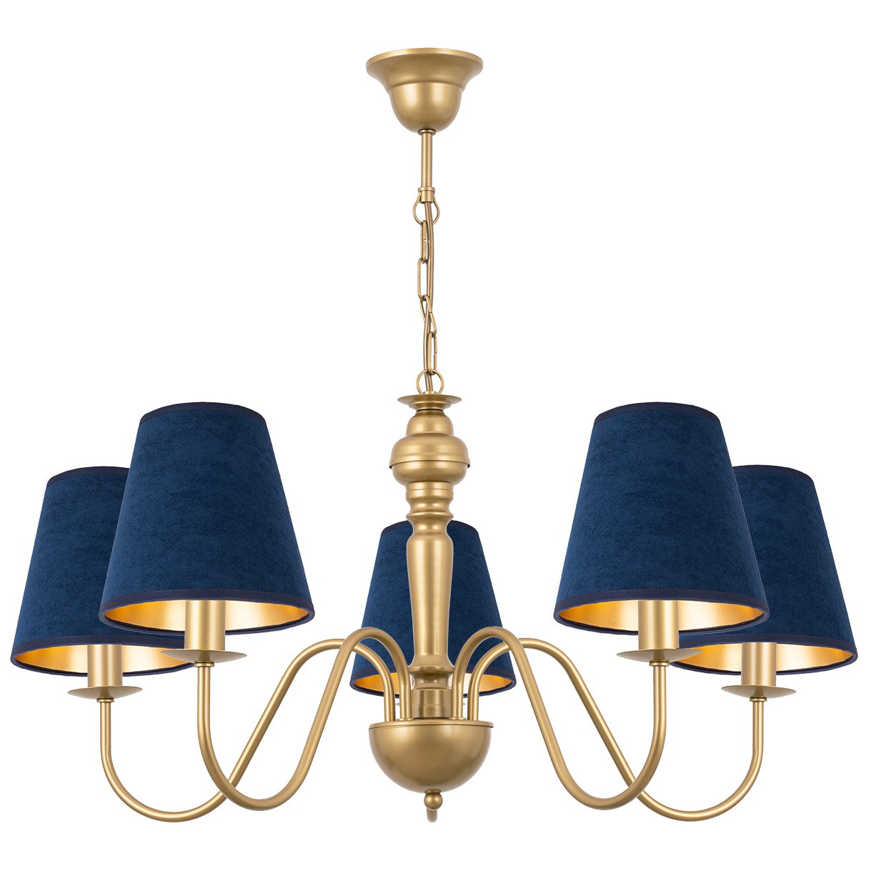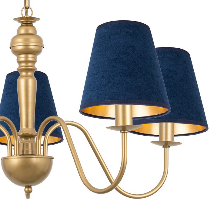 Złoty żyrandol z granatowymi abażurami do salonu GOLDSUN AB 1336G/17/55 5-płomienny