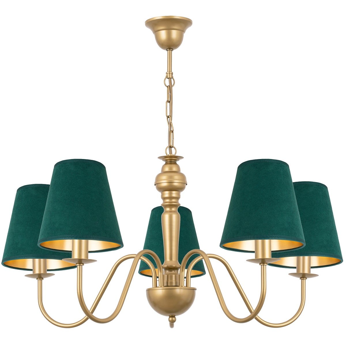 Złoty żyrandol z zielonymi abażurami do salonu GOLDSUN AB 1336G/17/54 5-płomienny