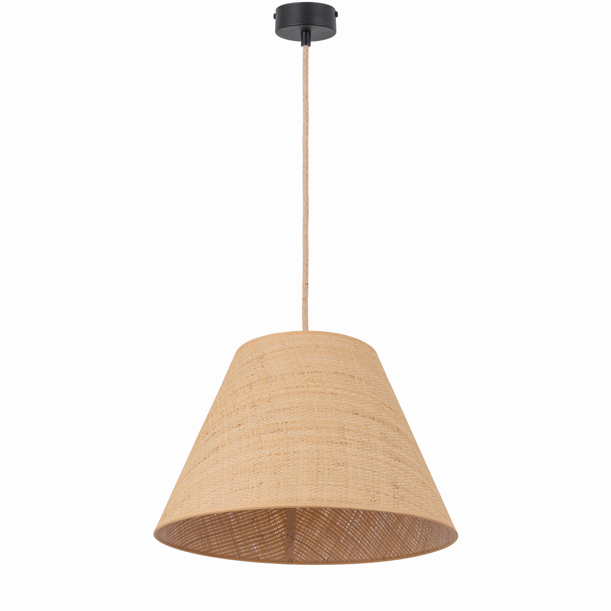 | Materiał | metalowa podsufitka w kolorze CZARNYM, przewód w jutowej otulinie w kolorze NATURALNYM, abażur pleciony z naturalnych materiałów - rattan - przyklejony na przeźroczystą pleksi |