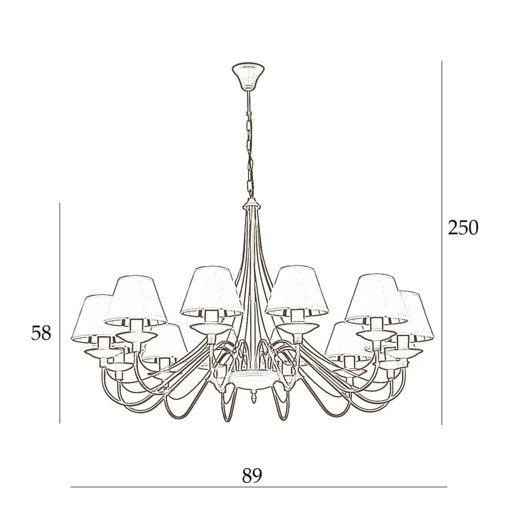 Stylowy żyrandol 12-ramienny to idealna propozycja do przestronnych wnętrz. Klasyczna forma i ponadczasowa kolorystyka tej lampy wiszącej będą pasowały do wielu aranżacji. Uroku tej imponującej lampie dodają niewielkie abażurki z wysokiej jakości tkaniny w białym kolorze.