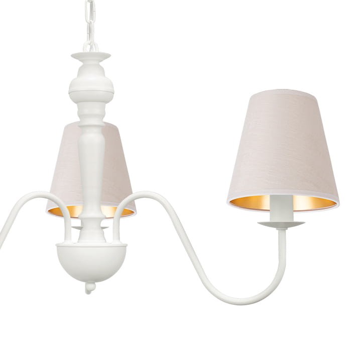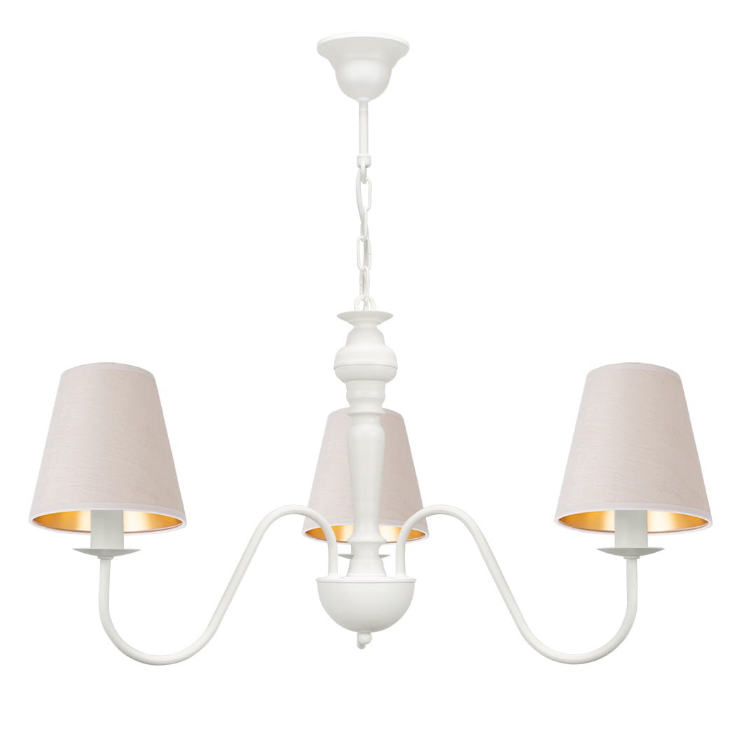 Żyrandol biały w stylu tradycyjnym GOLDSUN z trzema ramionami i abażurami z białego weluru to jasna i elegancka lampa do wnętrz, w których liczy się spokój i równowaga. Welurowy materiał miękko rozprasza światło, tworząc ciepłą atmosferę. Biały, metalowy stelaż w zestawieniu z jasnymi kloszami daje subtelny i harmonijny wygląd. Lampa dobrze sprawdzi się w salonie, sypialni lub jadalni, dodając przestrzeni lekkości i elegancji.