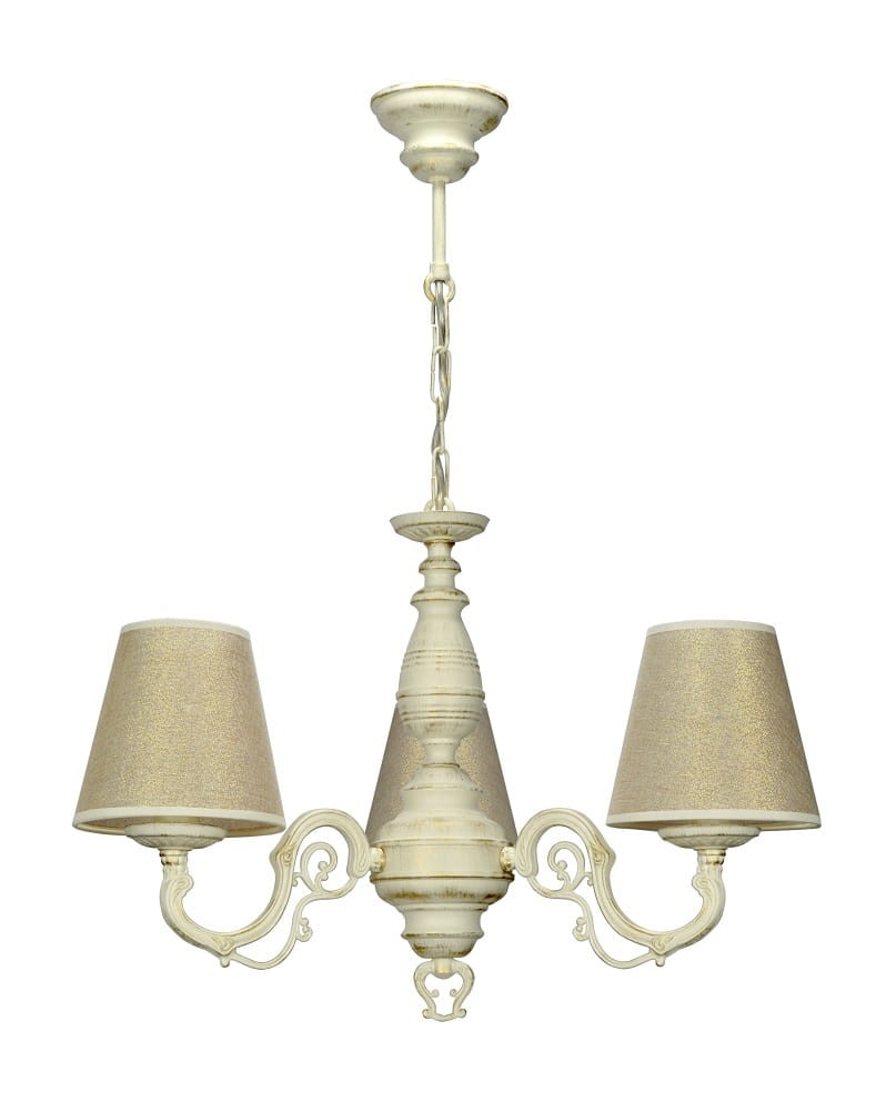 Gustowny żyrandol do klasycznych wnętrz w subtelnych odcieniach ecru i złota. Żyrandol zachwyca kształtem- połączenie ozdobnej tralki i dekoracyjnych ramion wspaniale komponuje się z naszymi złocistymi abażurkami. Wysokiej jakości lampa wisząca idealna do małych salonów, przytulnych sypialni czy stylizowanych kuchni. Żyrandol wypełni każde wnętrze ciepłym blaskiem.