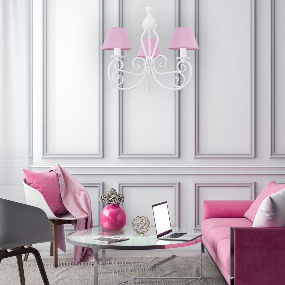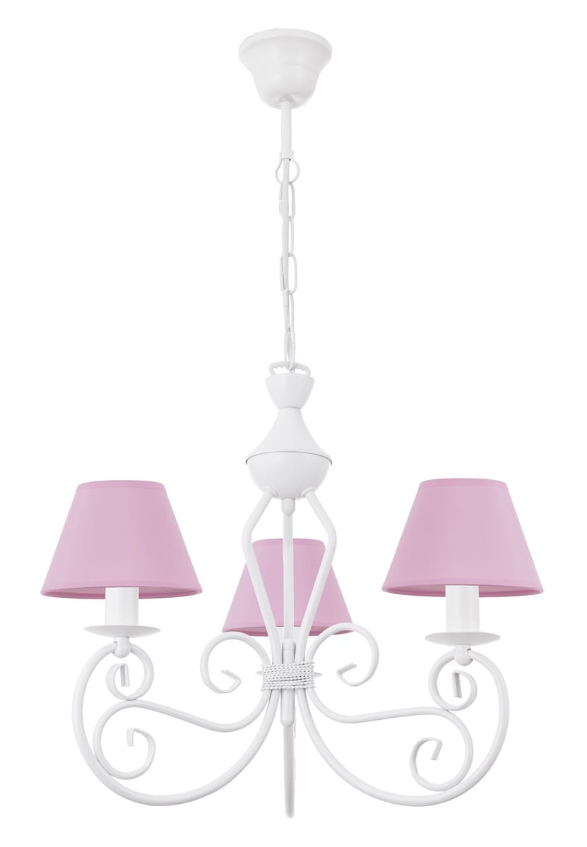 Biały żyrandol do pokoju dziecięcego DALIA 3-płomienny, to piękny, ponadczasowy model dedykowany do klasycznych wnętrz. Można powiesić go również w nowoczesnych przestrzeniach, będzie pięknie "przełamywał" styl, wprowadzając nieco ciepłego, eleganckiego looku. Żyrandol o pięknych ramionach składających się z finezyjnie wygiętych rureczek, które zostały wykończone małymi, różowymi abażurkami. Dla lepszego dopasowania lampy do swojego wnętrza można zmienić tkaninę abażurów na dowolną z palety poniżej.