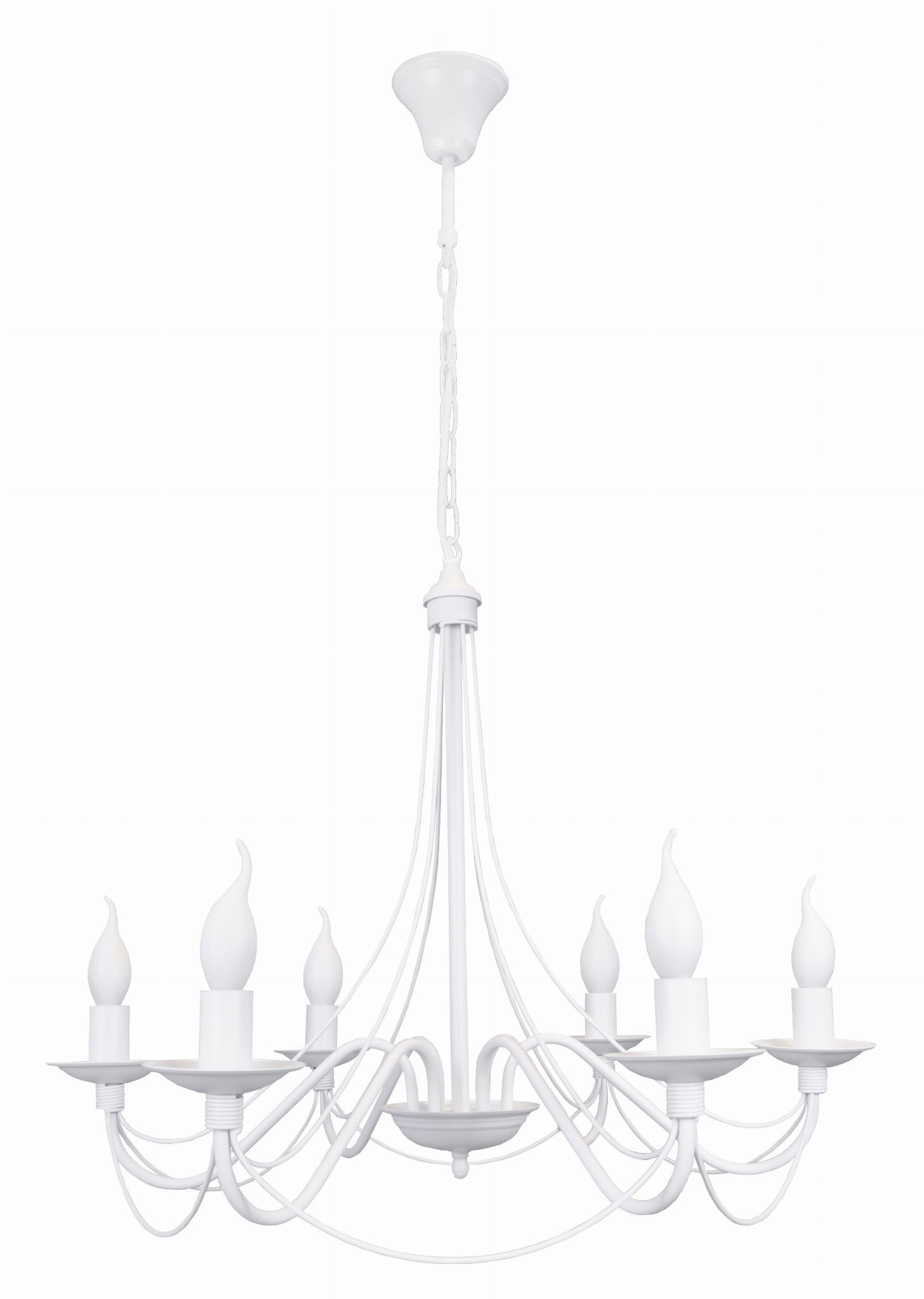 Piękny biały żyrandol do salonu, w modnym stylu prowansalskim. 6-ramienny żyrandol świecznikowy doda wnętrzu niesamowitego blasku i stylu. Wisząca lampa sufitowa przepięknie prezentuje się na tle jasnych mebli i naturalnych dodatków. Żarówki w kształcie płomienia świecy dodadzą urody temu wspaniałemu żyrandolowi.