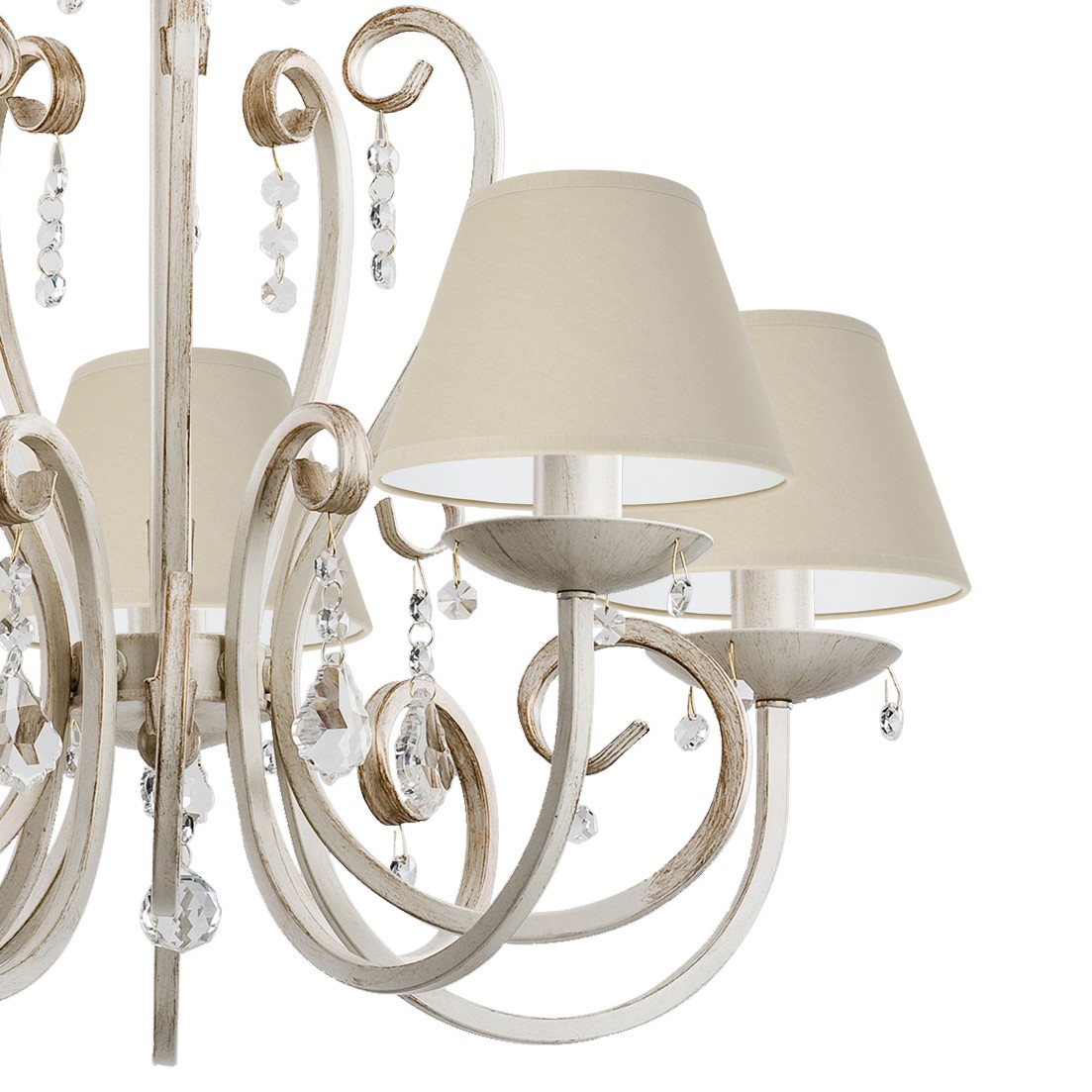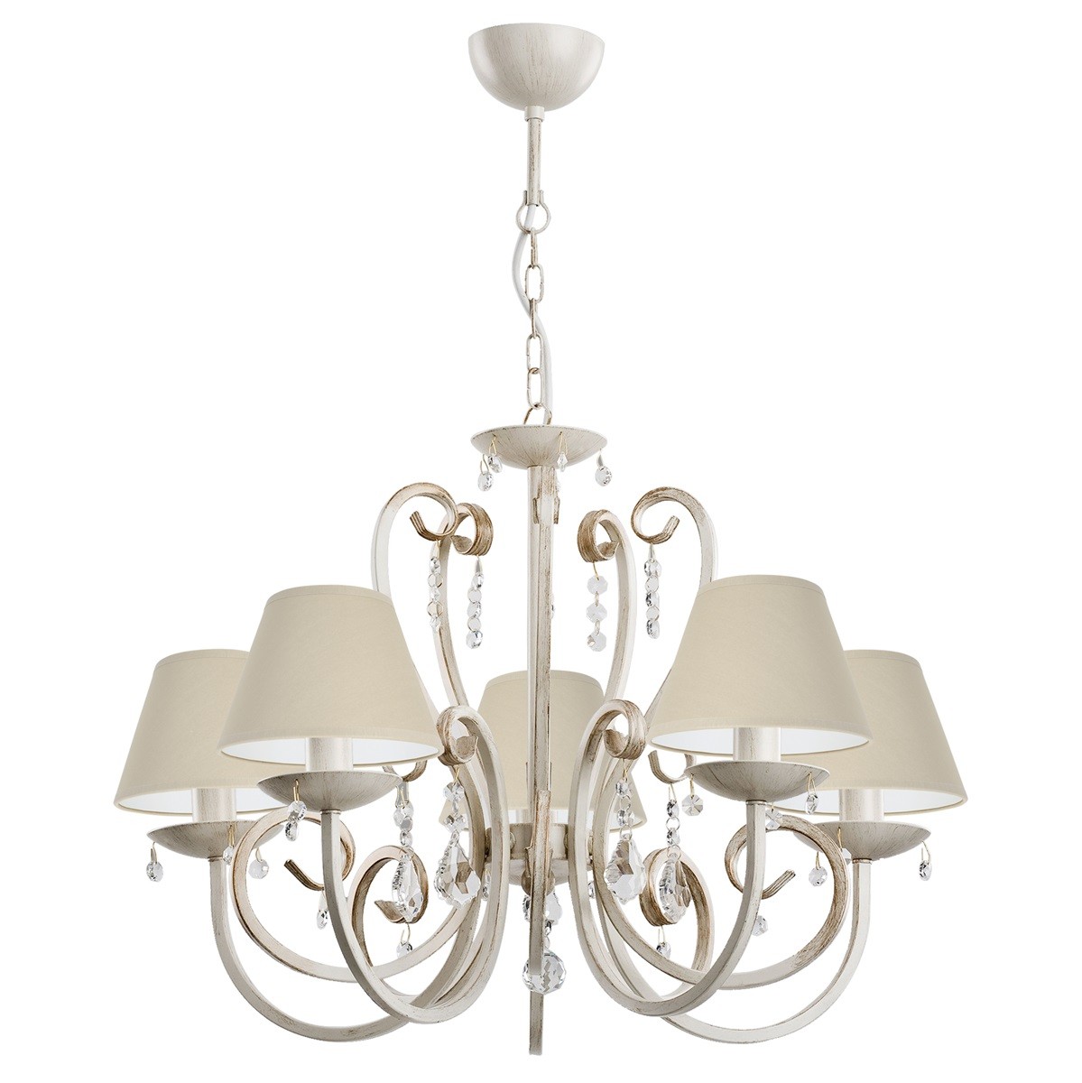 Prowansalski żyrandol z kryształkami uzupełni każde stylowe wnętrze. Klasyczny stelaż w odcieniach ecru ze złotem oraz drobne kryształki sprawiają, że lampa wygląda jednocześnie nowocześnie i elegancko. Propozycja dla osób szukających klasycznych, lecz niebanalnych rozwiązań.