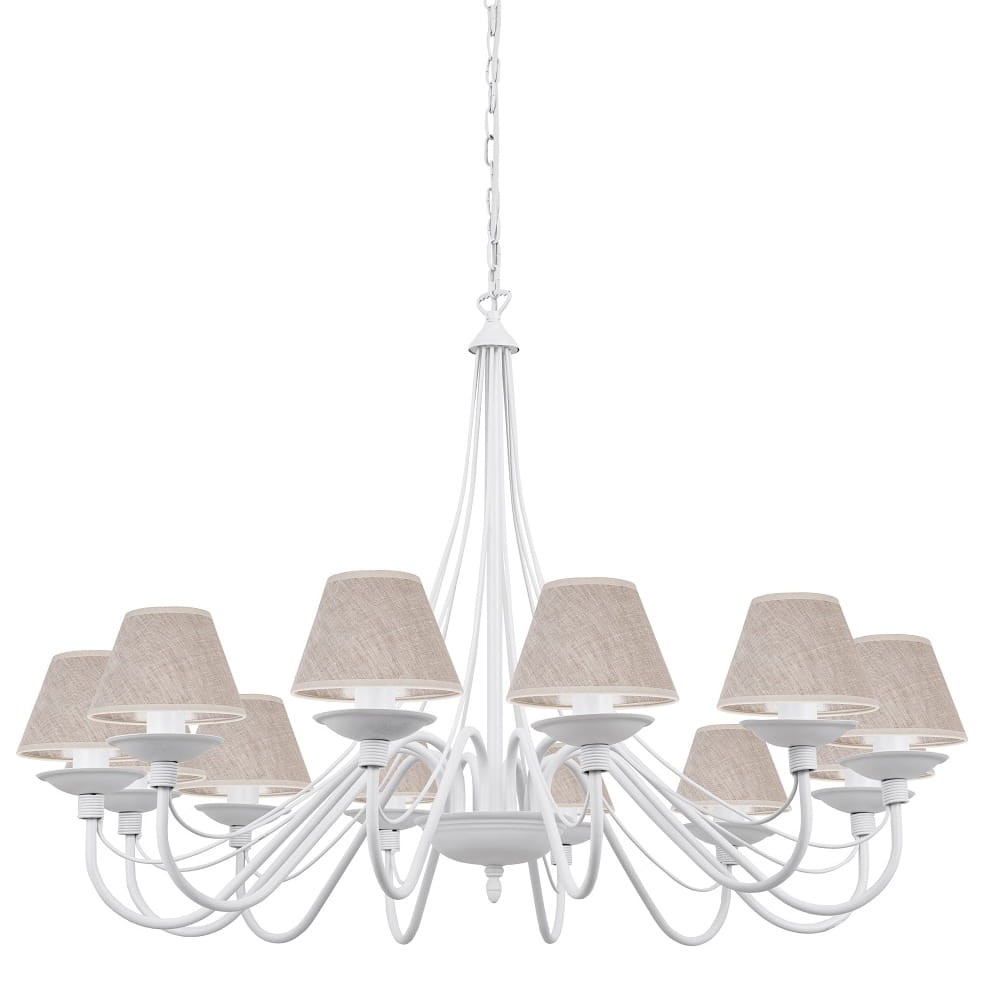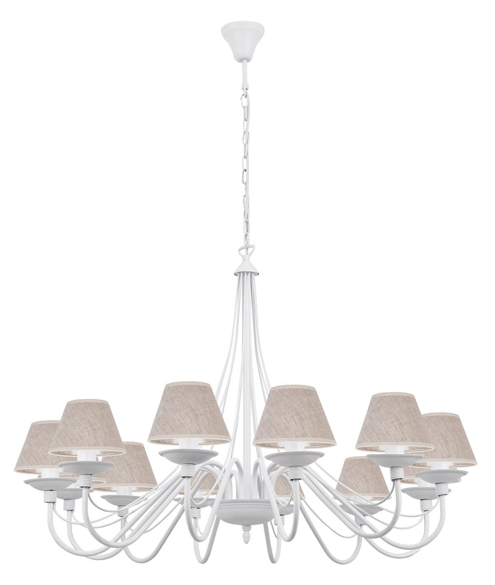 Imponujący duży biały żyrandol z abażurkami w kolorze lnianym. Stylowa 12-ramienna lampa sufitowa idealnie sprawdzi się w przestronnym wnętrzu. Klasyczne połączenie białego stelaża o ciekawym kształcie i białych abażurów sprawdzi się w wielu aranżacjach. Wspaniała lampa wisząca do dużego salonu lub holu.