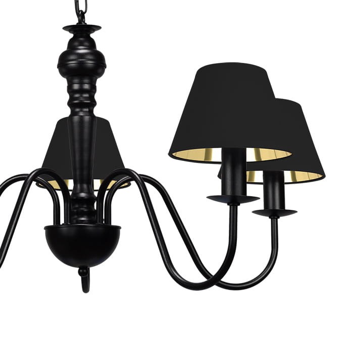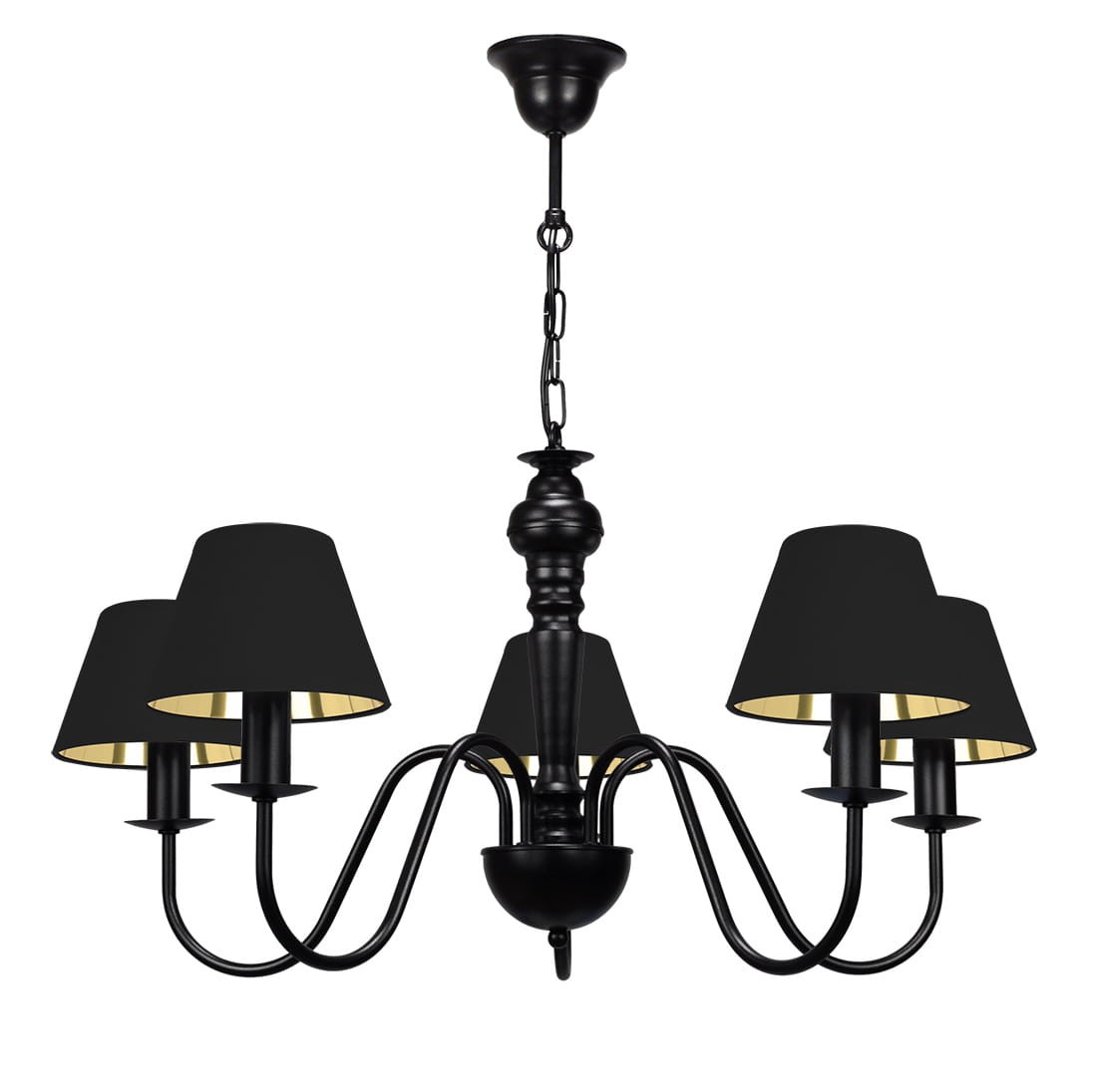 Żyrandol glamour czarno-złoty GOLDSUN. Żyrandol z czarnym stelażem i pięcioma abażurami w czarnym kolorze ze złotym środkiem to efektowna i elegancka propozycja do wnętrz z charakterem. Głęboka czerń tkaniny kontrastuje z błyszczącym, złotym wnętrzem, które pięknie rozprasza światło, dając ciepły, przytulny efekt. Idealna do salonu w stylu glamour, eleganckiej jadalni lub klasycznego gabinetu.