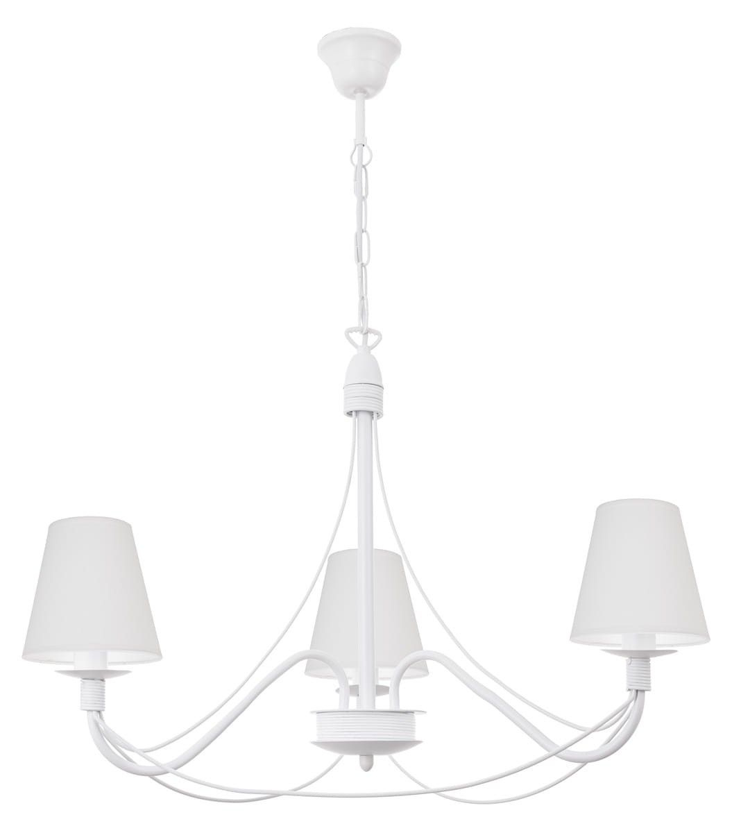 Żyrandol klasyczny do sypialni z abażurami. Klasyczny żyrandol w kolorze białym ze smukłym stelażem wykończony uniwersalnymi, ponadczasowymi białymi abażurami doda każdemu wnętrzu wyjątkowej elegancji. Idealny do niewielkiego salonu, jadalni lub sypialni. Abażury wykonane z certyfikowanych materiałów.