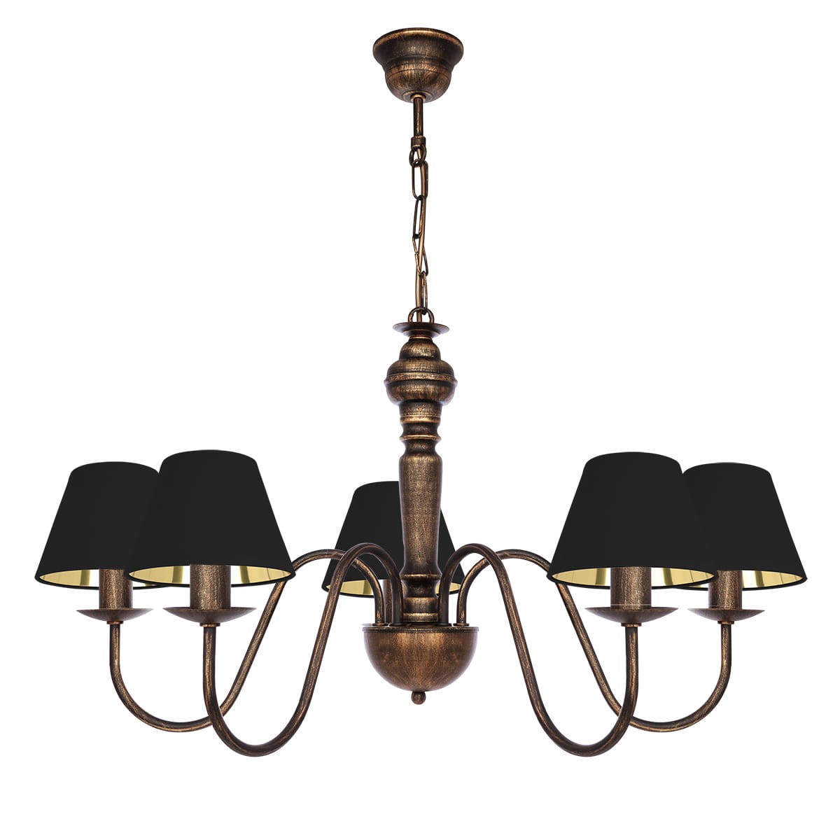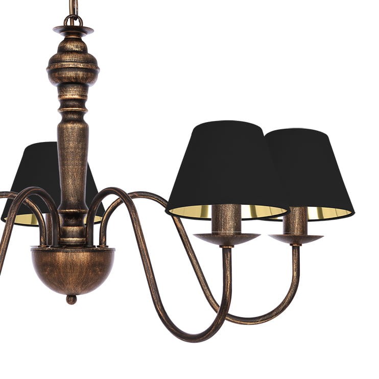 Żyrandol postarzany do salonu lub jadalni GOLDSUN z pięcioma ramionami i czarnymi abażurami ze złotym wnętrzem to elegancki wybór do stylowych wnętrz. Złote wnętrze kloszy pięknie odbija światło, tworząc ciepły i przytulny nastrój. Czarno-złoty stelaż dodaje całości charakteru i luksusowego wyglądu. Idealna do salonu, jadalni czy eleganckiego gabinetu.