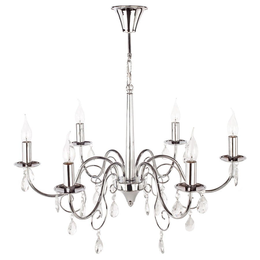 Elegancki żyrandol świecznikowy do salonu. Model został wyposażony w kryształki, które dodają blasku pomieszczeniu. Chromowany stelaż, w wysublimowanym kształcie, nawiązuje do stylu klasycznego, dlatego też prezentowana lampa sufitowa sprawdzi się w tego typu aranżacjach.