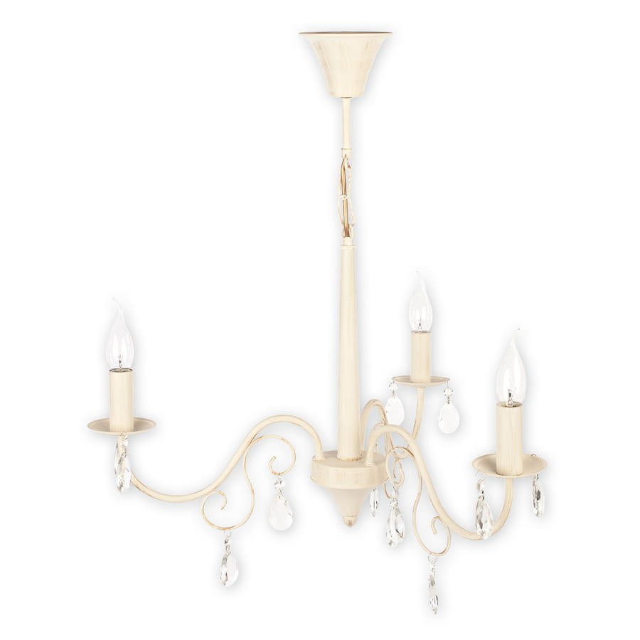 3-płomienny żyrandol świecznikowy do sypialni, przedpokoju, jadalni lub saloniku. Model utrzymany w stylu klasycznym, co dodatkowo podkreśla kolor antycznej bieli (ecru patynowany złotem). Lampa została przyozdobiona drobnymi kryształkami, które błyszczą pod wpływem odbitego światła.