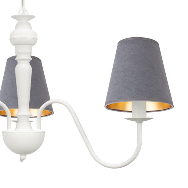 Żyrandol szaro-biały do sypialni GOLDSUN na białym stelażu z trzema ramionami i abażurami z szarego weluru to stylowa propozycja, która łączy prostotę z elegancja. Kontrast między jasnym stelażem a miękkimi, welurowymi kloszami w odcieniu szarości nadaje lampie wyjątkowego charakteru. Prosta budowa sprawia, że doskonale wpasuje się zarówno w aranżacje minimalistyczne, nowoczesne, jak i klasyczne. To idealny wybór do sypialni, salonu czy jadalni, gdzie podkreśli elegancję i styl wnętrza.