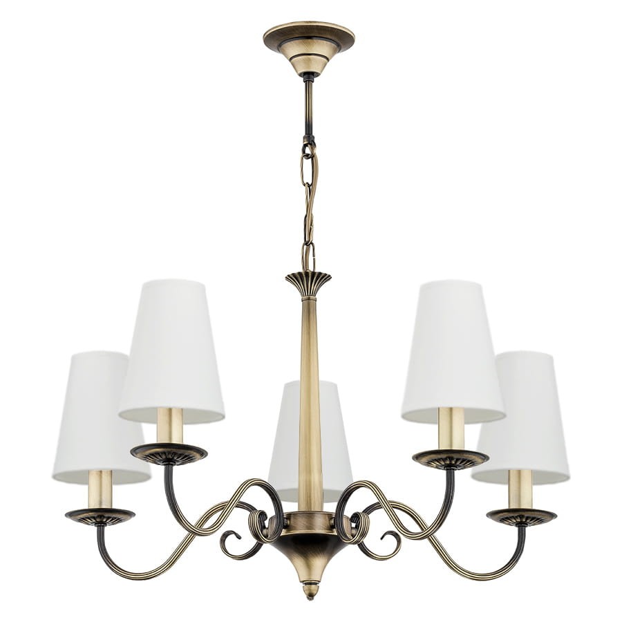 5-ramienny żyrandol w stylu klasycznym do eleganckich wnętrz. Prezentowana lampa sufitowa w kolorze patyny pasuje do gustownie urządzonych wnętrz z akcentami starego złota. Białe abażury 2S uzupełniają i ocieplają całość.