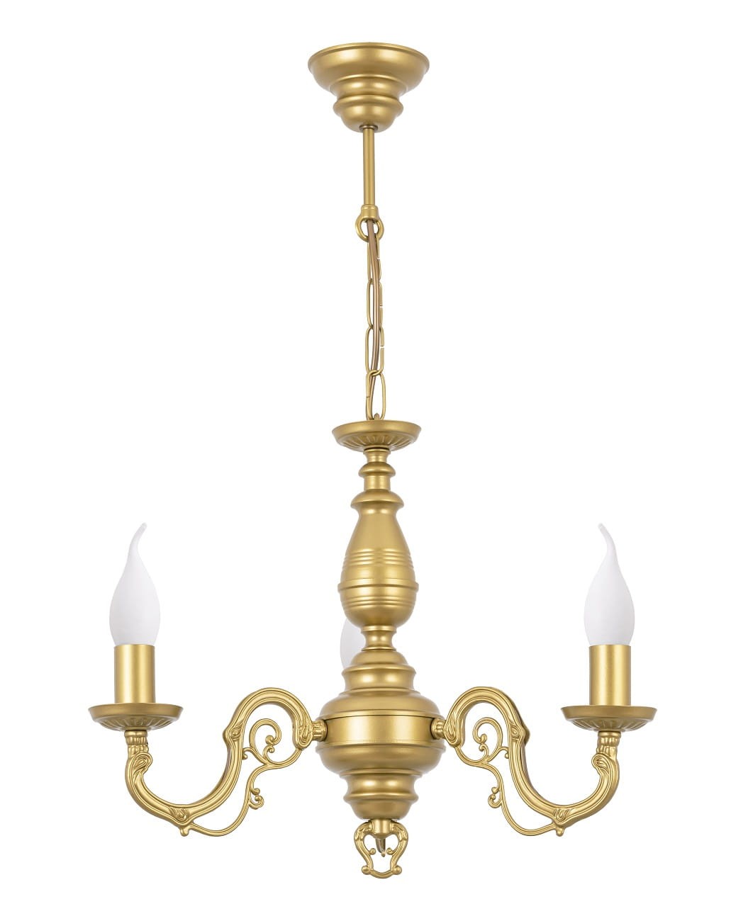 Przepiękny żyrandol w stylu klasycznym. Potrójna lampa wisząca w pięknym odcieniu złota cudownie komponuje się z klasycznym wystrojem wnętrza w jasnych, ciepłych odcieniach. Żyrandol zwraca uwagę pięknym kształtem- centralny punkt stanowi ozdobna, metalowa tralka, do której przymocowano bardzo dekoracyjne ramiona. Z żarówkami typu "płomyk" lampa prezentuje się zachwycająco. Klasyka w najlepszym wydaniu, ponadczasowy kształt i doskonałe wykonanie to duże atuty tego żyrandola.