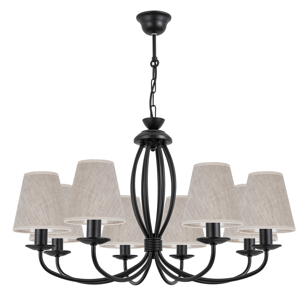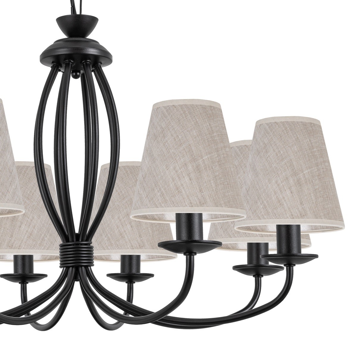 Żyrandol w stylu rustykalnym czarny OLIVER 8-płomienny. Wyjątkowe salony wymagają niebanalnej oprawy ale też dopasowanego do nich oświetlenia. 8 punktów świetlnych w żyrandolu OLIVER doskonale spełni wymagania przestronnych salonów, jednocześnie dzięki swojej wyjątkowości będzie jego efektowną ozdobą w centralnym punkcie. Czarny stelaż wykończony abażurami z chłodnego lnu tworzy sielski, rustykalny efekt, podkreślając styl wnętrz urządzonych w podobnym klimacie.