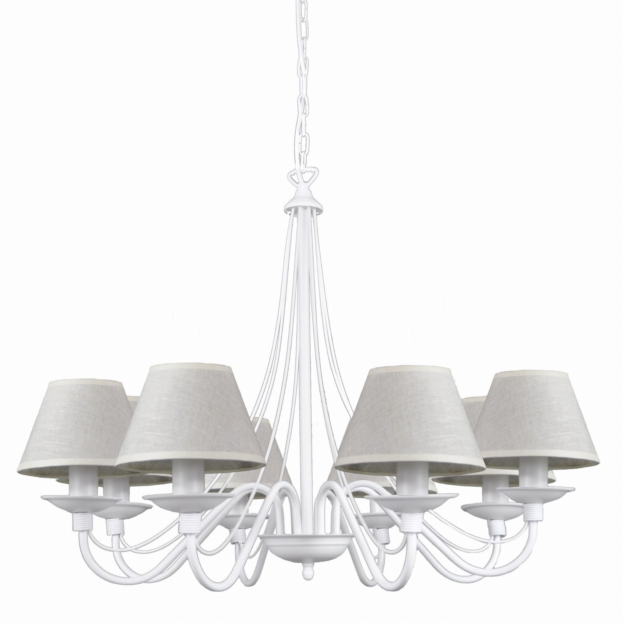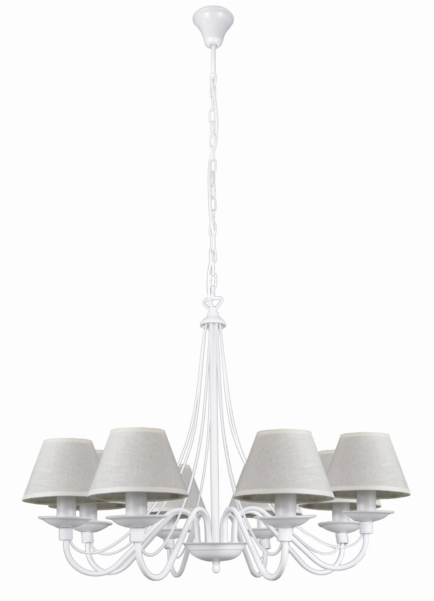 Stylowy żyrandol z abażurami. Biały stelaż, starannie wykonany z metalu uzupełniają abażury wykonane z wysokiej jakości lnianej tkaniny. 8-ramienna lampa wisząca wspaniale komponuje się z dodatkami w stylu prowansalskim i shabby chic. Żyrandol ROMA doda przytulności i ciepłego blasku salonowi, sypialni lub pokojowi dziennemu.