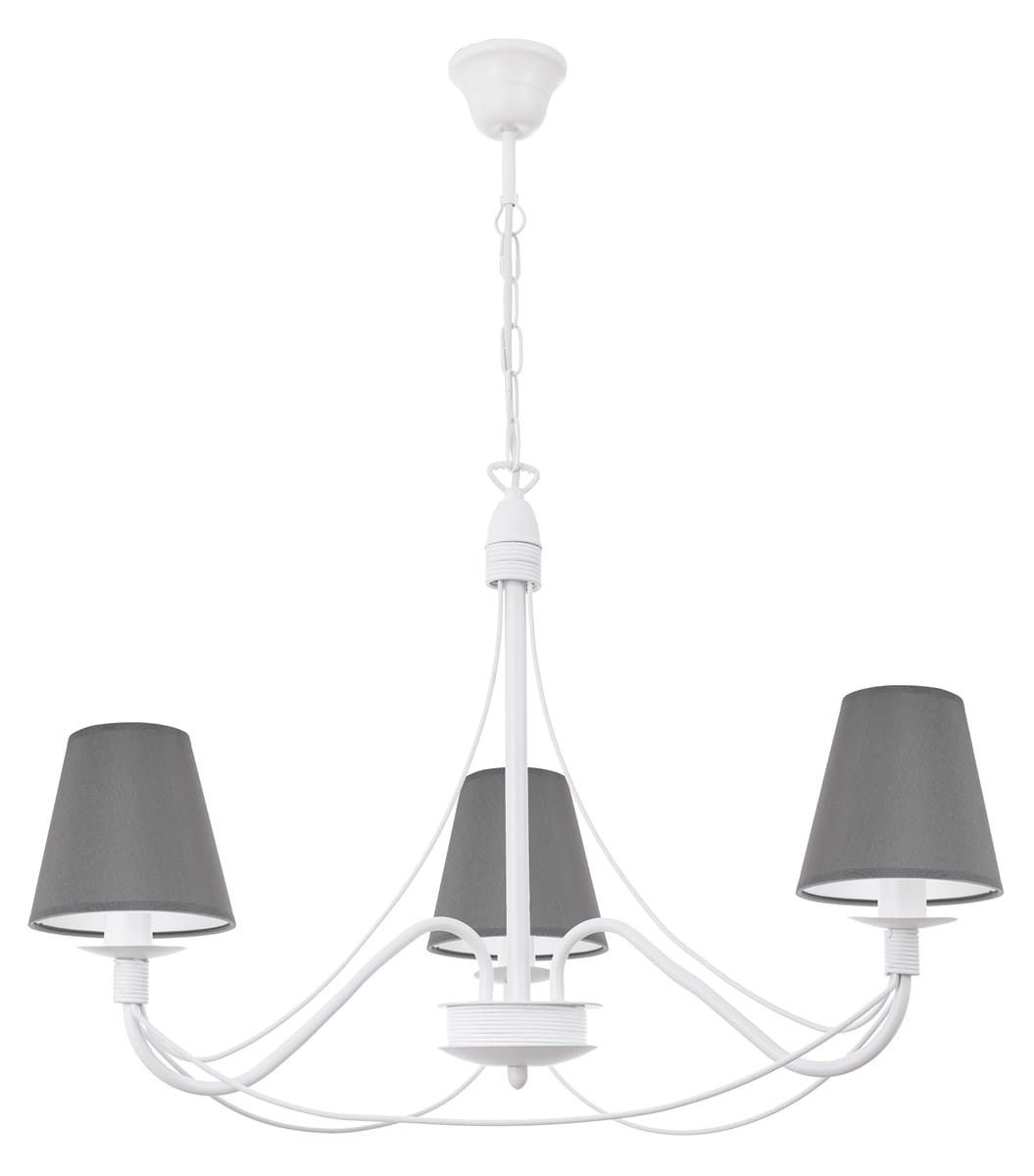 Żyrandol z abażurami do pokoju. Klasyczny żyrandol w kolorze białym ze smukłym stelażem wykończony uniwersalnymi, ponadczasowymi szarymi abażurami doda każdemu wnętrzu wyjątkowej elegancji. Idealny do niewielkiego salonu, jadalni lub sypialni. Abażury wykonane z certyfikowanych materiałów.