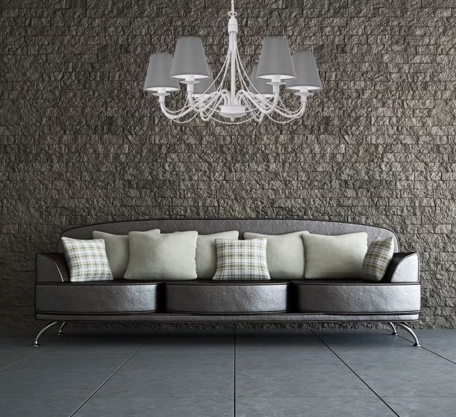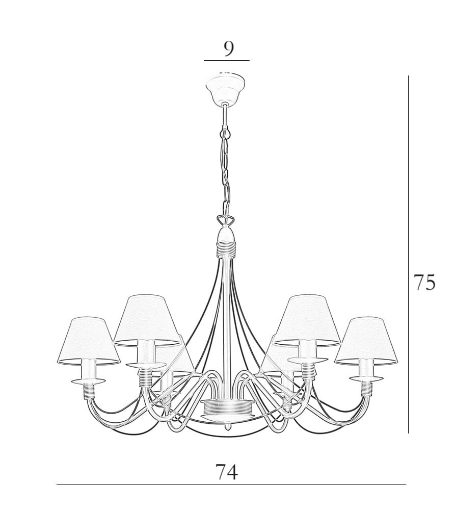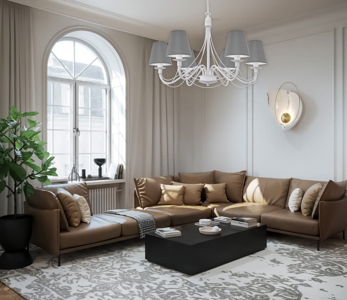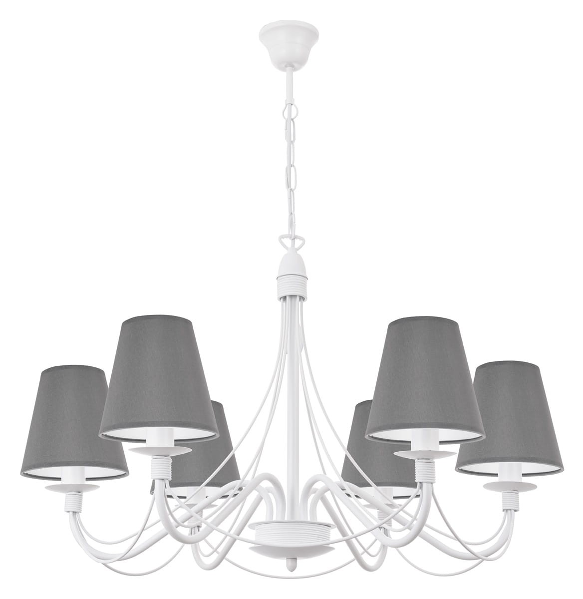 Elegancki klasyczny żyrandol. Klasyczny żyrandol ze smukłym stelażem wykończony uniwersalnymi, ponadczasowymi szarymi abażurami doda każdemu wnętrzu wyjątkowej elegancji. Idealny do salonu, jadalni lub sypialni. Abażury wykonane z certyfikowanych materiałów.
