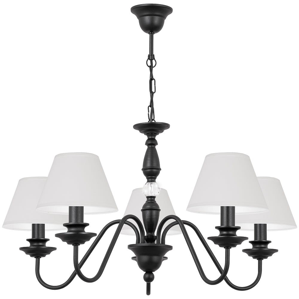 Żyrandol z kryształem 5-płomienny KRISTAL. Duży żyrandol na czarnym stelażu z białymi abażurkami zachwyca swoją precyzyjnością wykonania jak i nienagannym wyglądem. Wpasuje się w każde wnętrze w domu nadając mu niepowtarzalnego klimatu. Ozdobiony dużym przeźroczystym kryształem.