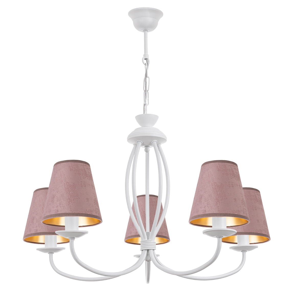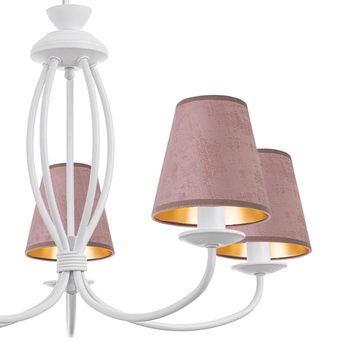 Żyrandol z różowymi welurowymi abażurami OLIVER to pięcioramienna lampa sufitowa z białym stelażem i różowymi abażurami z weluru. Zestawienie jasnej bieli z delikatnym różem tworzy elegancki i przytulny efekt. Miękki materiał abażurów dodaje wnętrzu ciepła i przyjemnej atmosfery. Lampa idealnie pasuje do kobiecych sypialni, jasnych salonów czy jadalni.